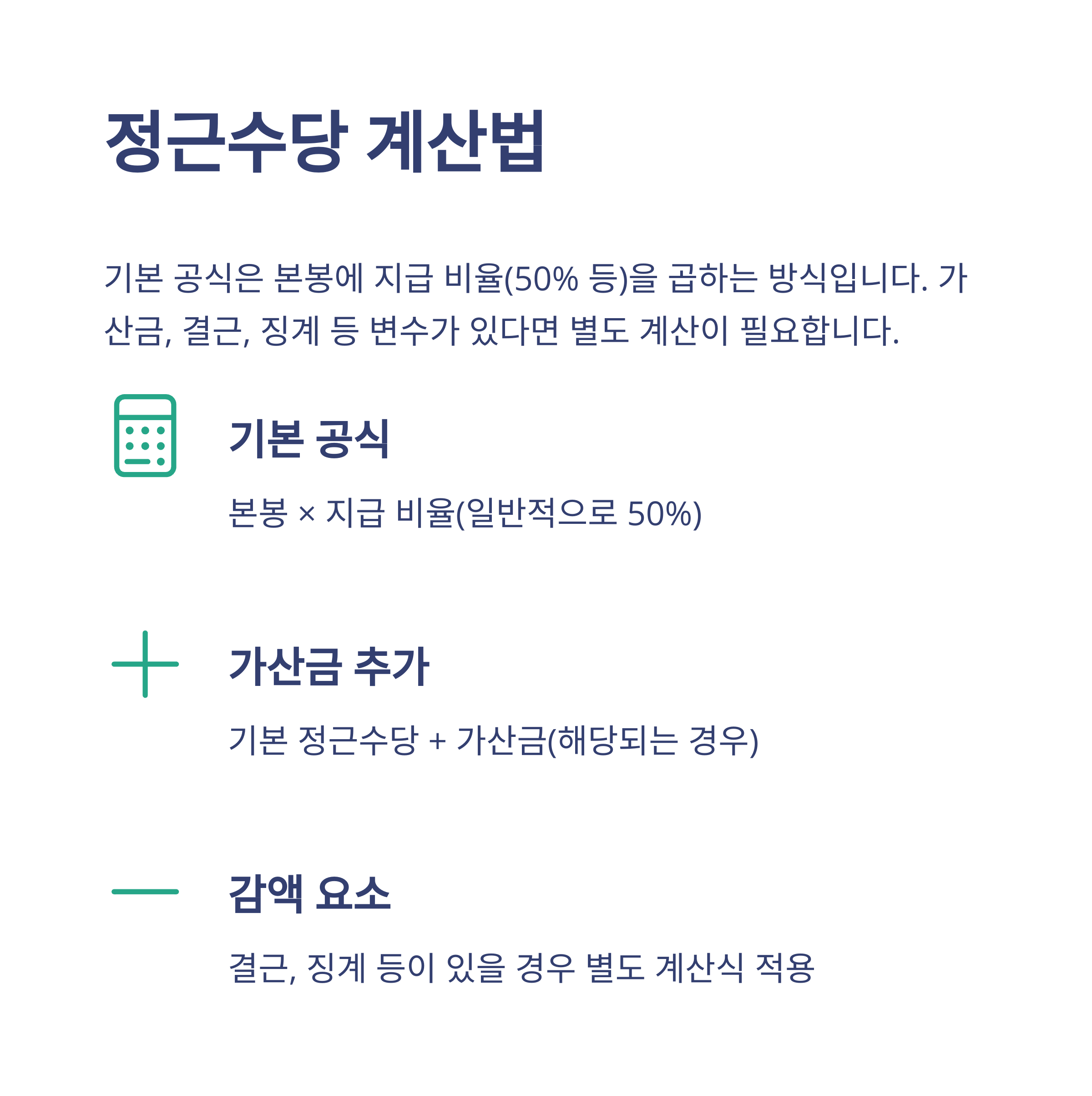 - 기본 공식: 본봉 × 정근수당 지급 비율(50% 등)