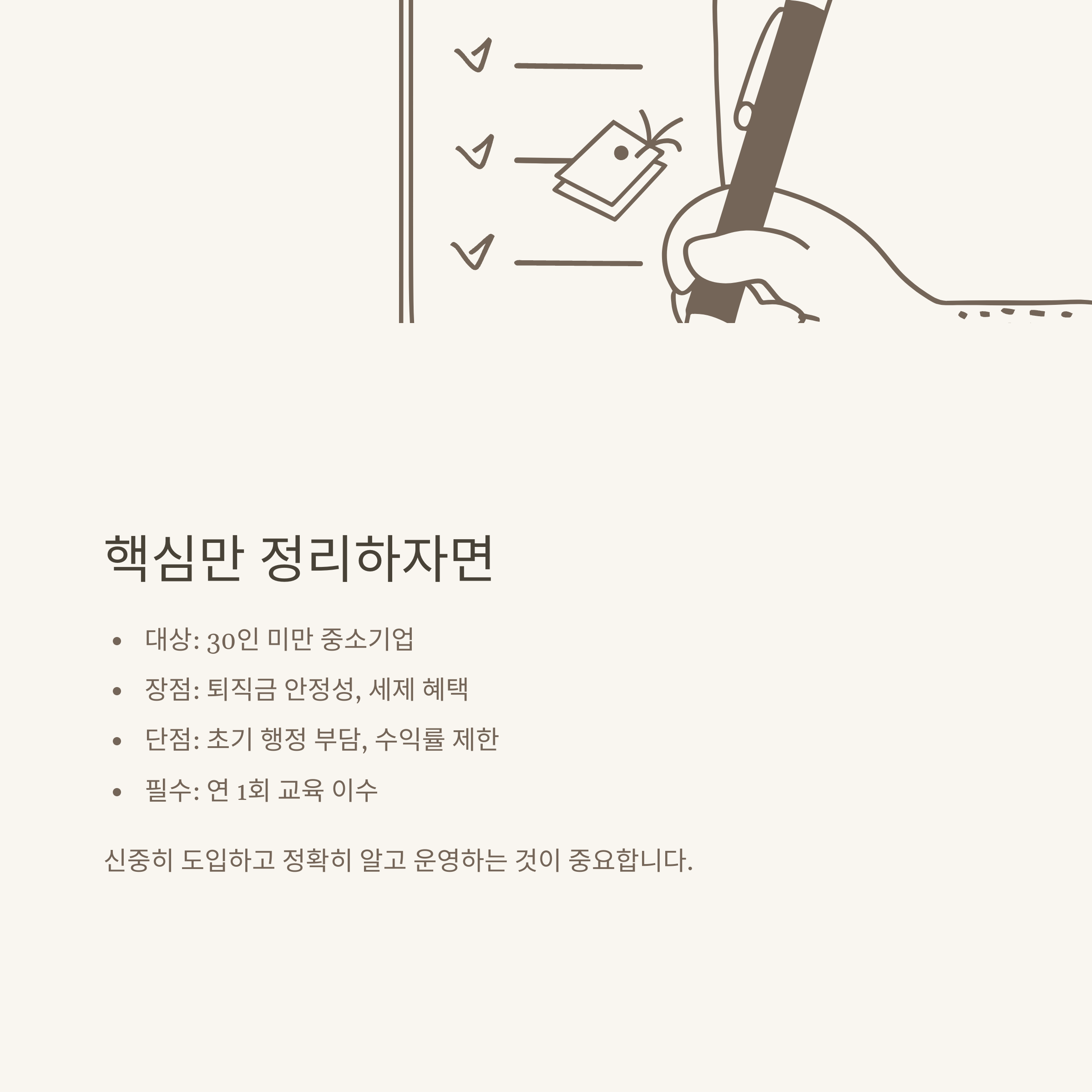 첫째, 도입 초기에는 직원 동의서 작성, 공단 신청 등 행정적 번거로움이 적지 않습니다. 둘째, 기금형이기 때문에 일부 운용수익이 낮거나, 운용방식이 다소 보수적으로 제한될 수 있다는 점이 있습니다.