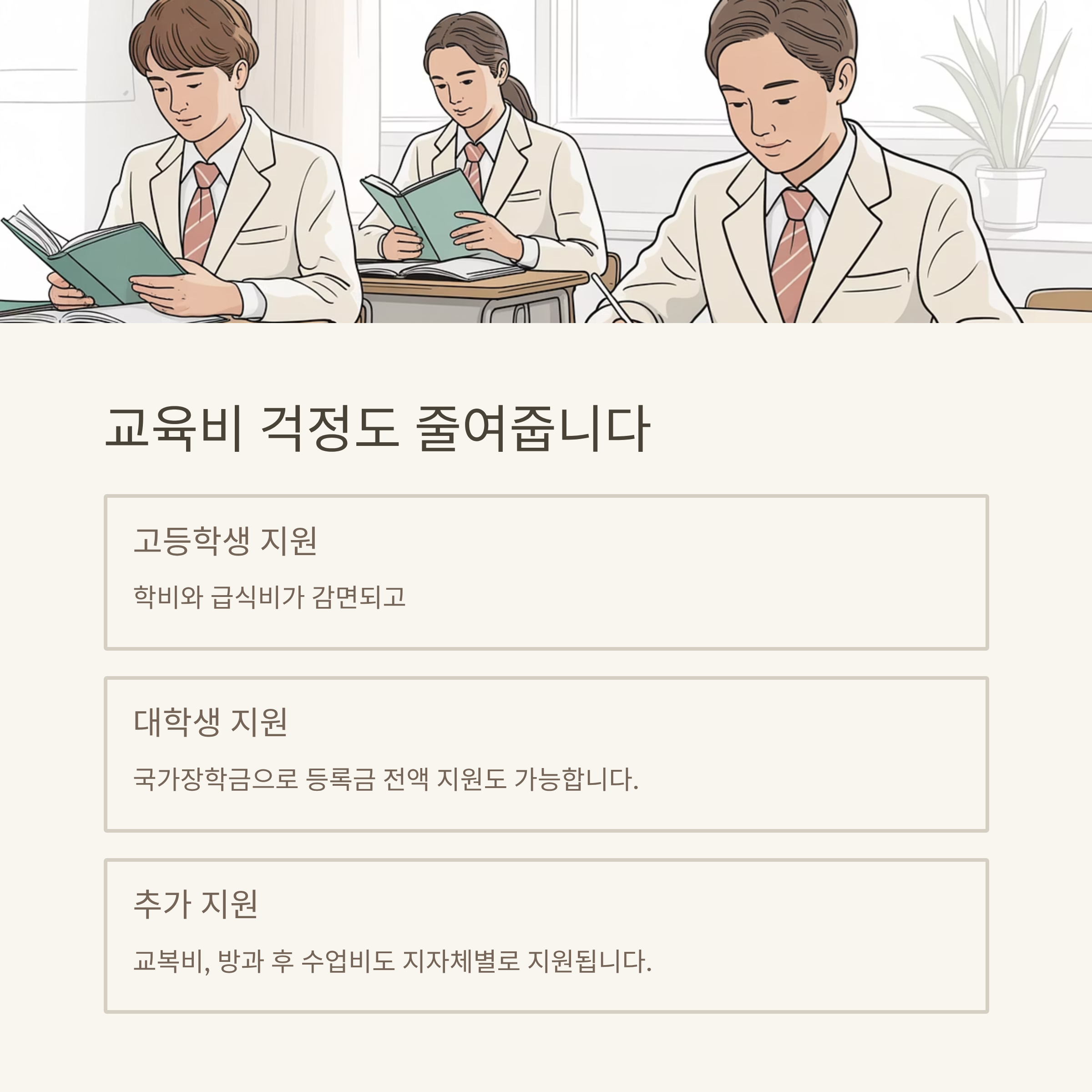 - 고교 학비 면제: 등록금 및 급식비 전액 또는 일부 감면