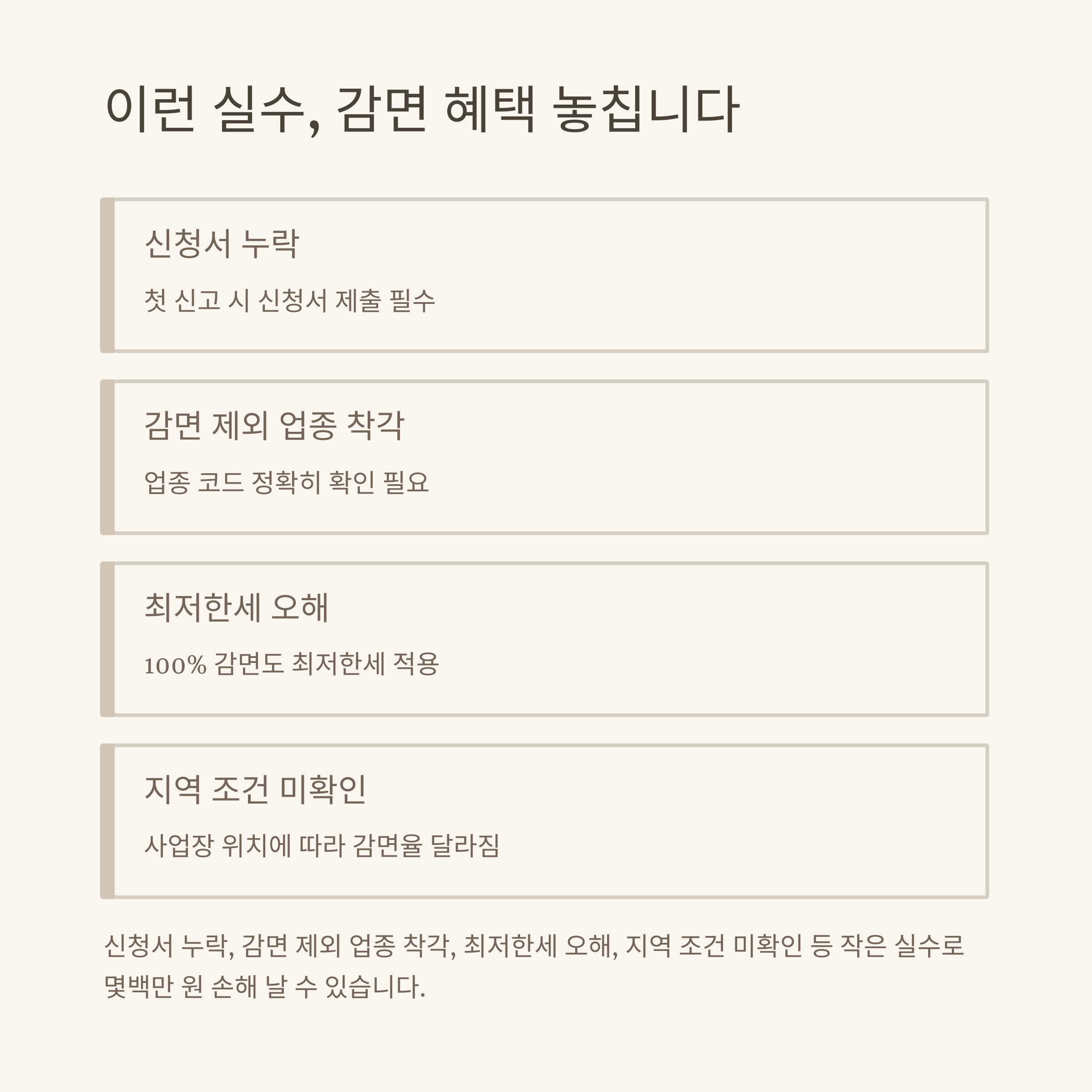 감면 제도는 분명 큰 혜택이지만, 저 역시 직접 경험하면서 실수하거나 주변에서 오해로 손해 보는 사례를 많이 봤습니다. 주요 실수 유형과 대처 팁을 아래에 정리했습니다.