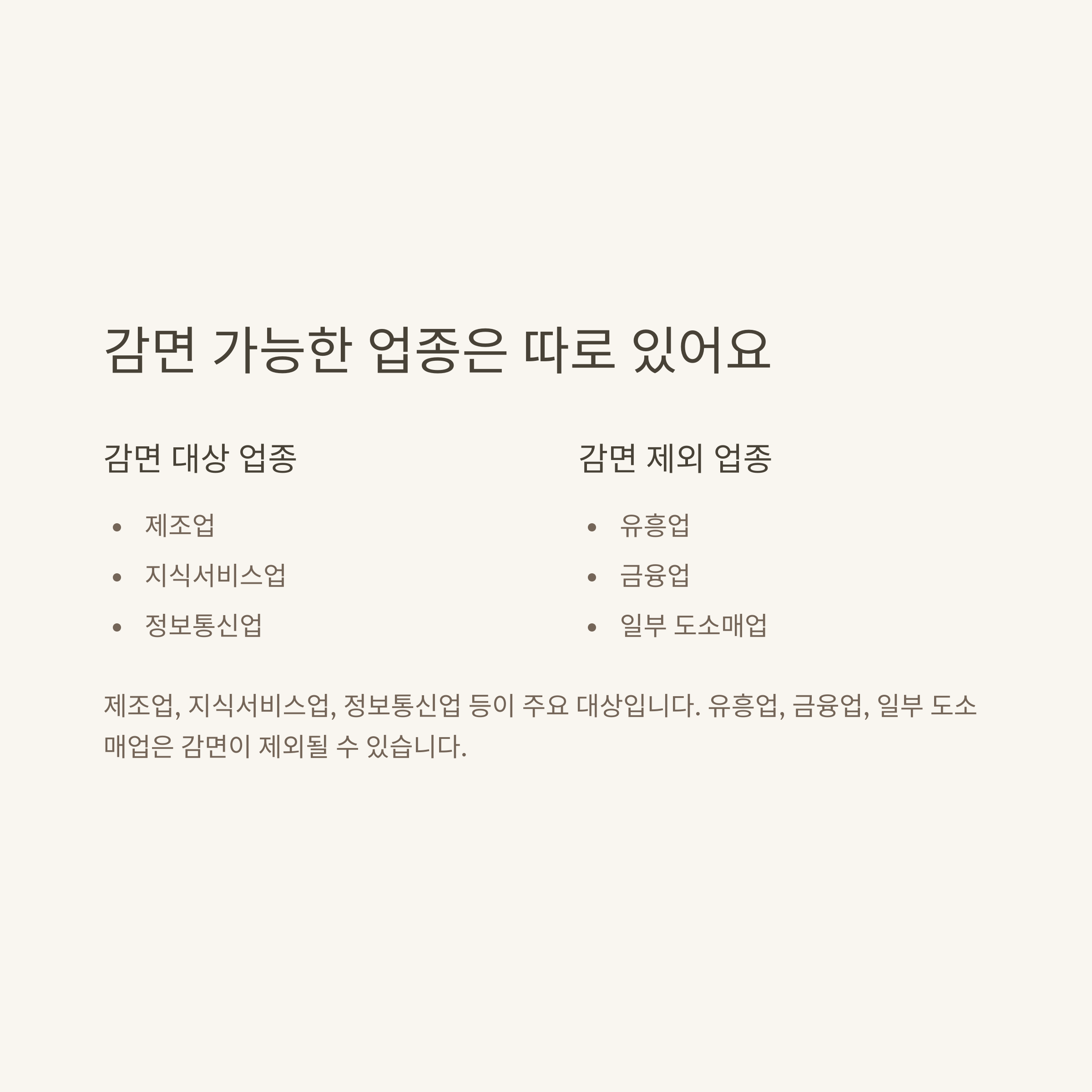 - 감면 제외 업종: 유흥/향락업, 부동산업, 금융/보험업, 전문/공공서비스, 기타 단순 도소매 일부