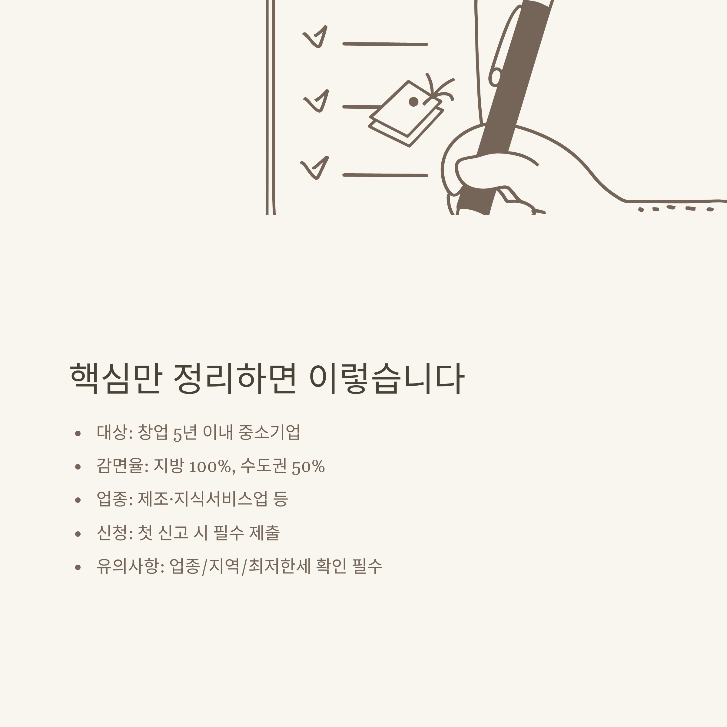 - 감면 적용 지역: 수도권 과밀억제권역 외 지역 우선(일부 업종 예외 적용)