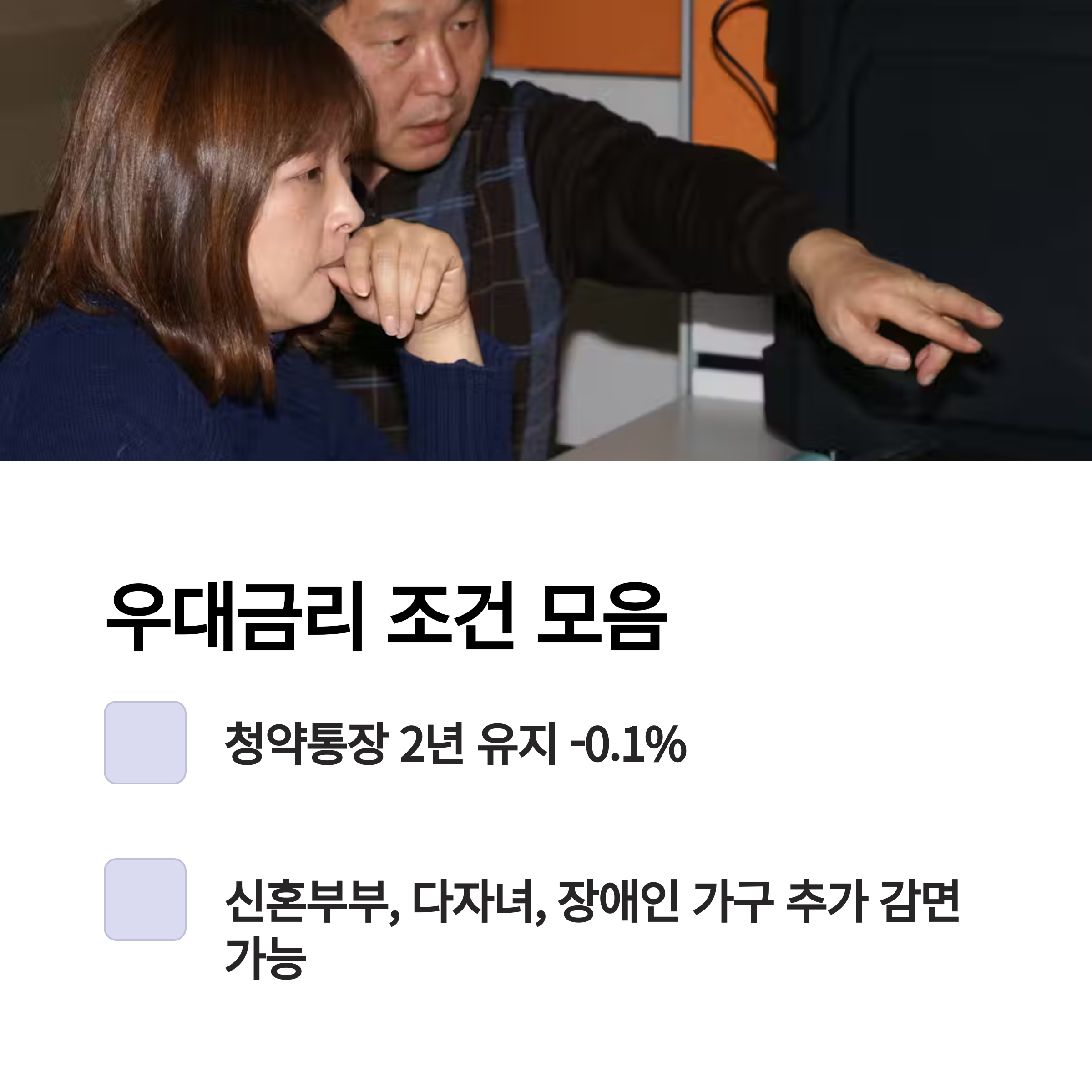 - 청약통장 2년 이상 유지: -0.1% 금리 감면