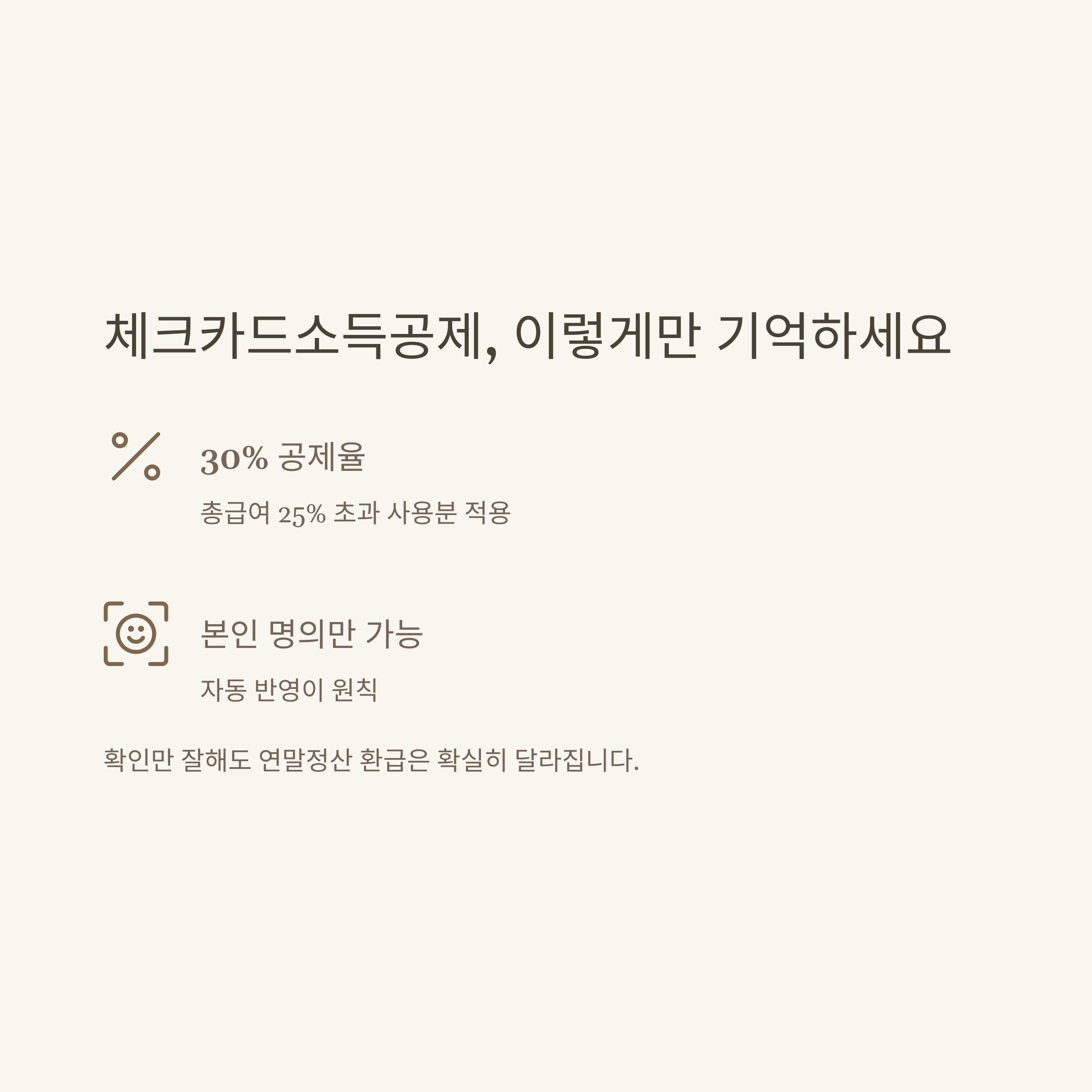 - 공제 대상: 본인 명의의 체크카드, 현금영수증, 신용카드 사용분