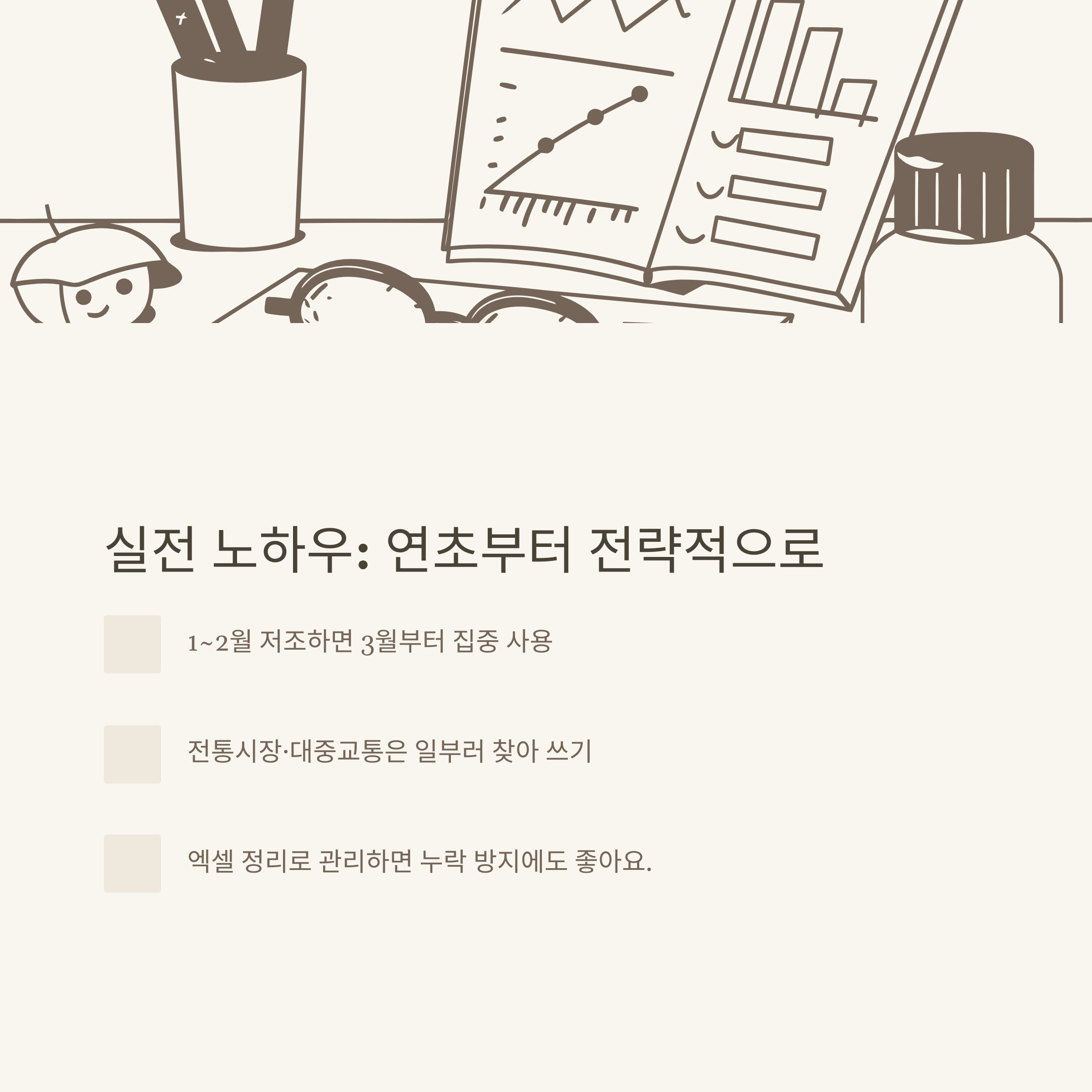 가장 먼저 한 건, 월별 체크카드 사용액을 따로 기록해서 총급여 25%를 언제 초과하는지 체크하는 일이었습니다. 1~2월에 사용이 적으면, 3월부터는 생활비 대부분을 체크카드로 결제하면서 계획적으로 조정했어요. 또, 전통시장·대중교통 등 추가 공제 항목도 일부러 찾아 썼던 적도 있습니다.