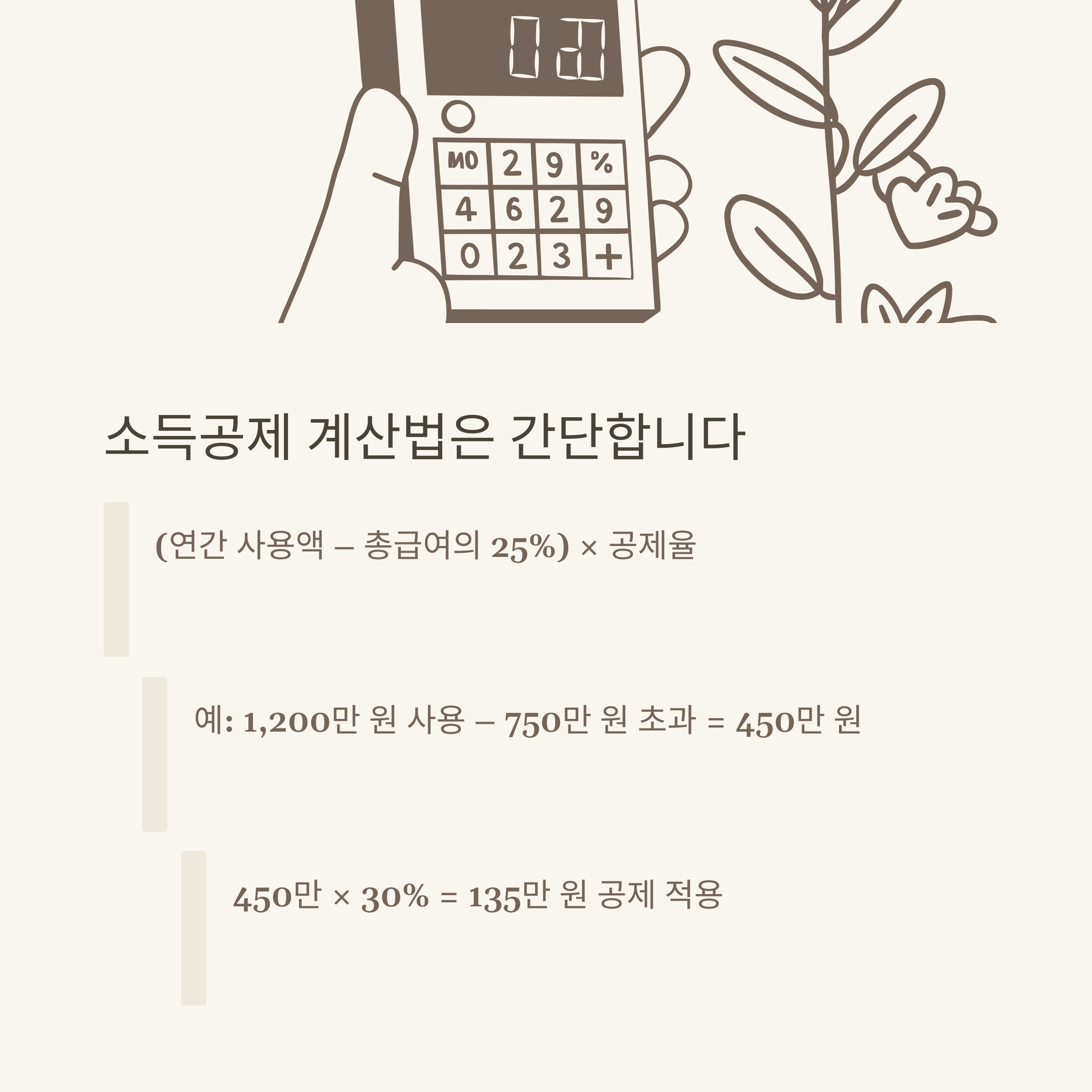 총급여 25% 초과분 | 연간 사용액 – (총급여 × 25%) | 1,200만 – 750만 = 450만 원 |