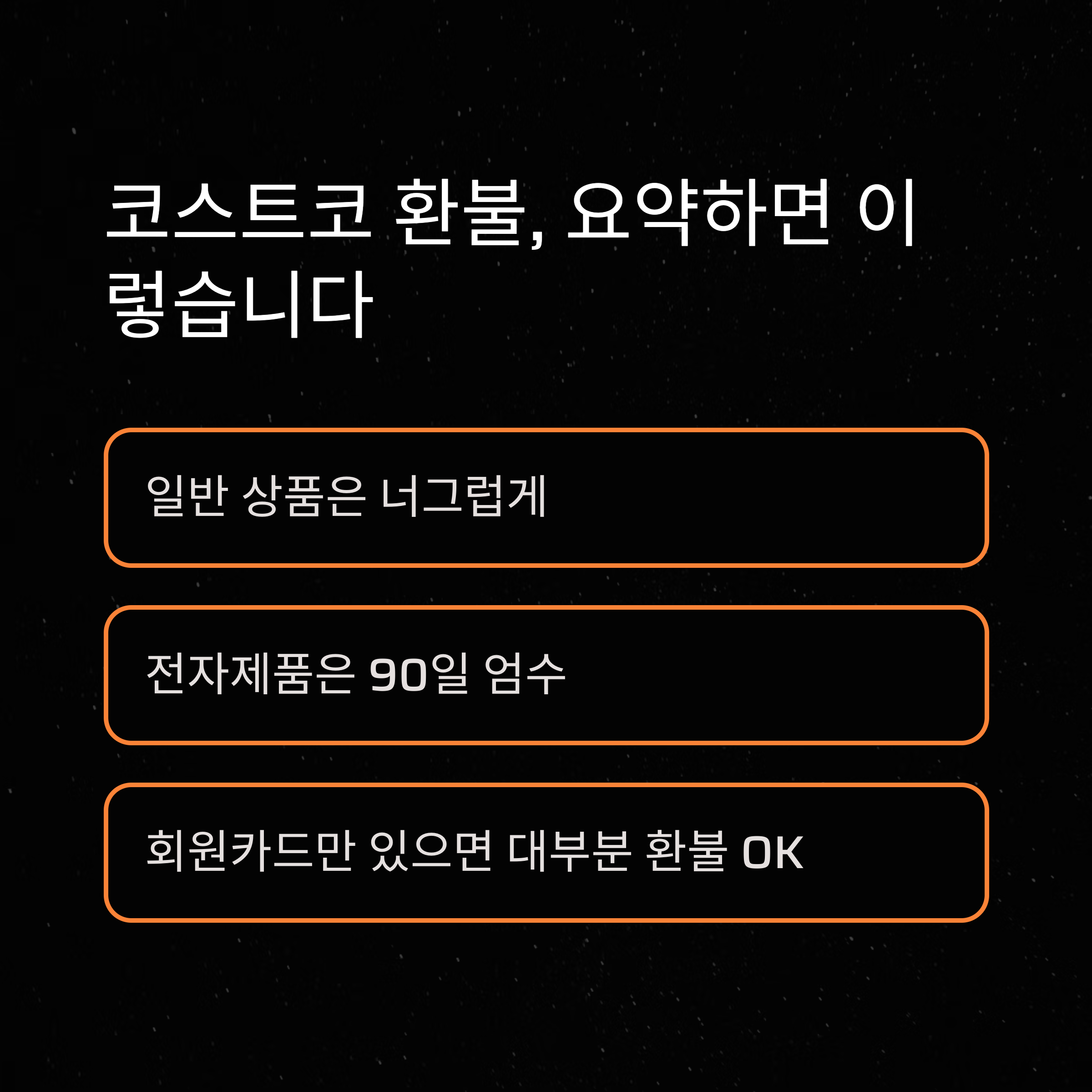 이 규정은 코스트코 공식 반품 규정에서도 명확히 확인할 수 있으며, 전자제품은 일반 식품류보다 훨씬 엄격한 반품 기한이 있다는 점 기억하세요.