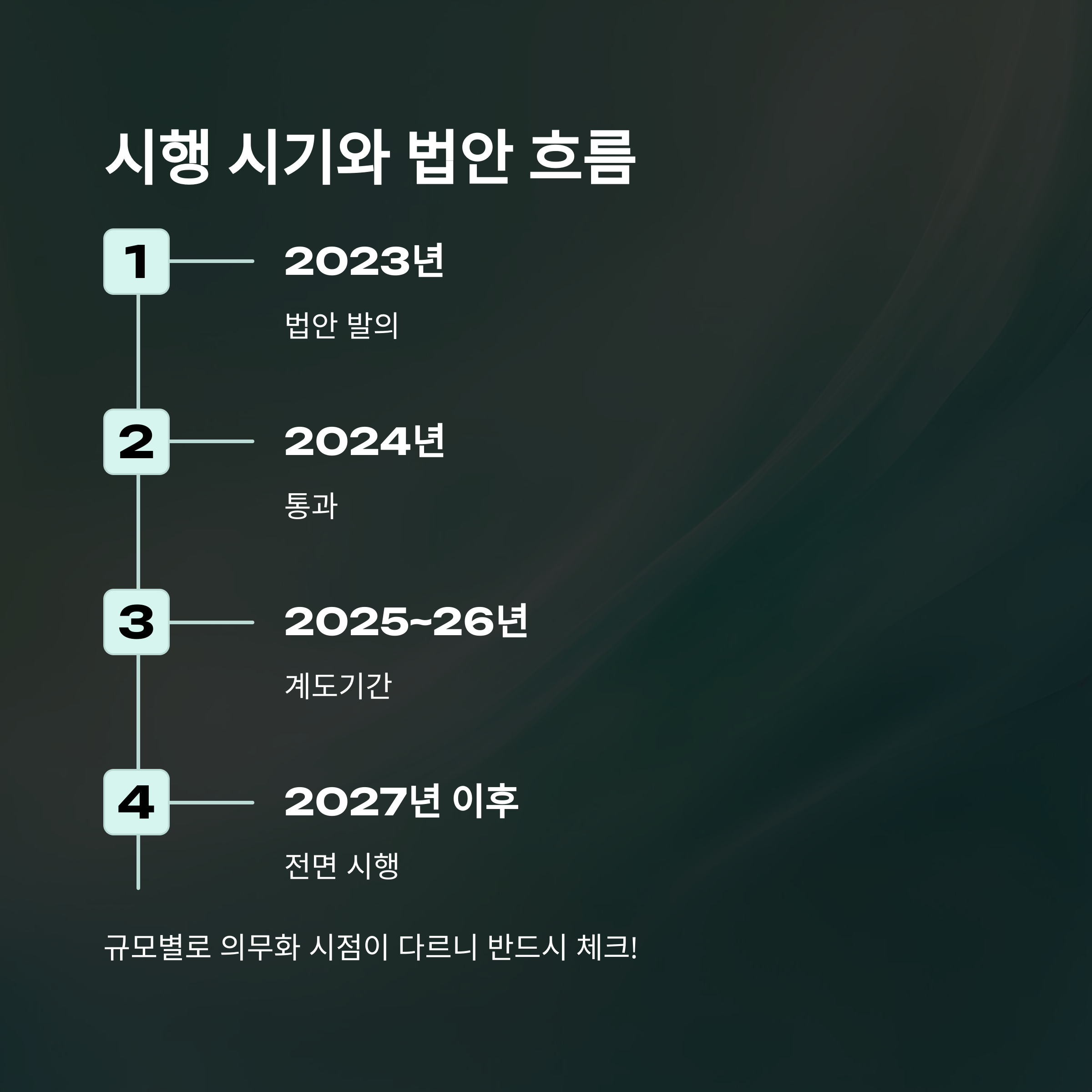 | 계도기간 | 2025년~2026년 | 준비를 위한 유예기간 |