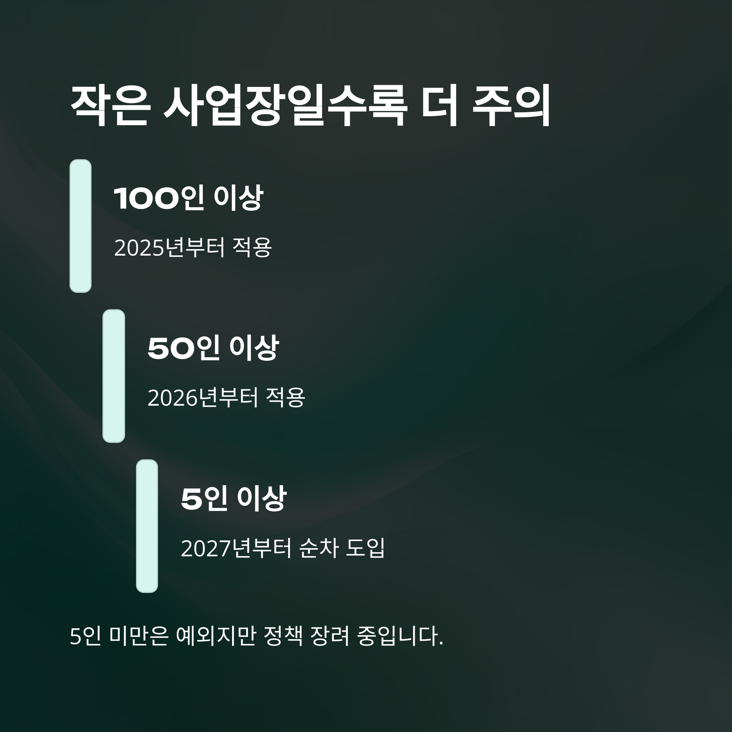 사업장 규모에 따라 단계적으로 의무 기간이 다릅니다. 제 경험으론 규모가 작은 곳일수록 준비가 느려서 가이드라인 기반 점검이 필요하다는 의견이 많았어요.