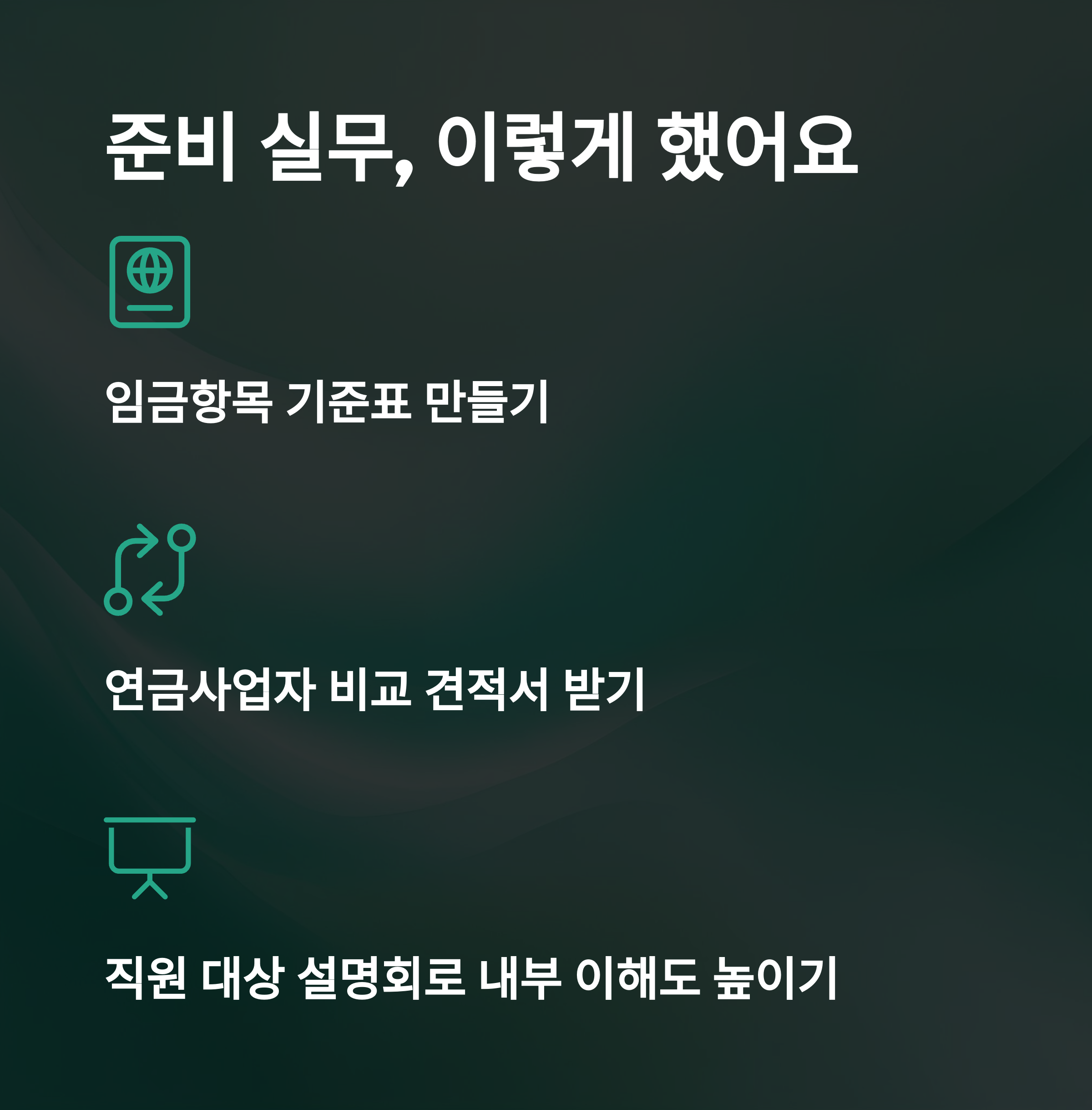 제가 리딩한 프로젝트 당시, 가장 먼저 했던 건 ‘통상임금 판별 기준서’ 제작이었어요. 임금 항목을 항목별로 정리해 노무사와 함께 검토했고, 그 이후 연금사업자 선정과 내부 교육까지 순차적으로 진행했습니다. 정말 정신 없었지만, 단계별 체크리스트 덕분에 실수 없이 착착 진행됐습니다.