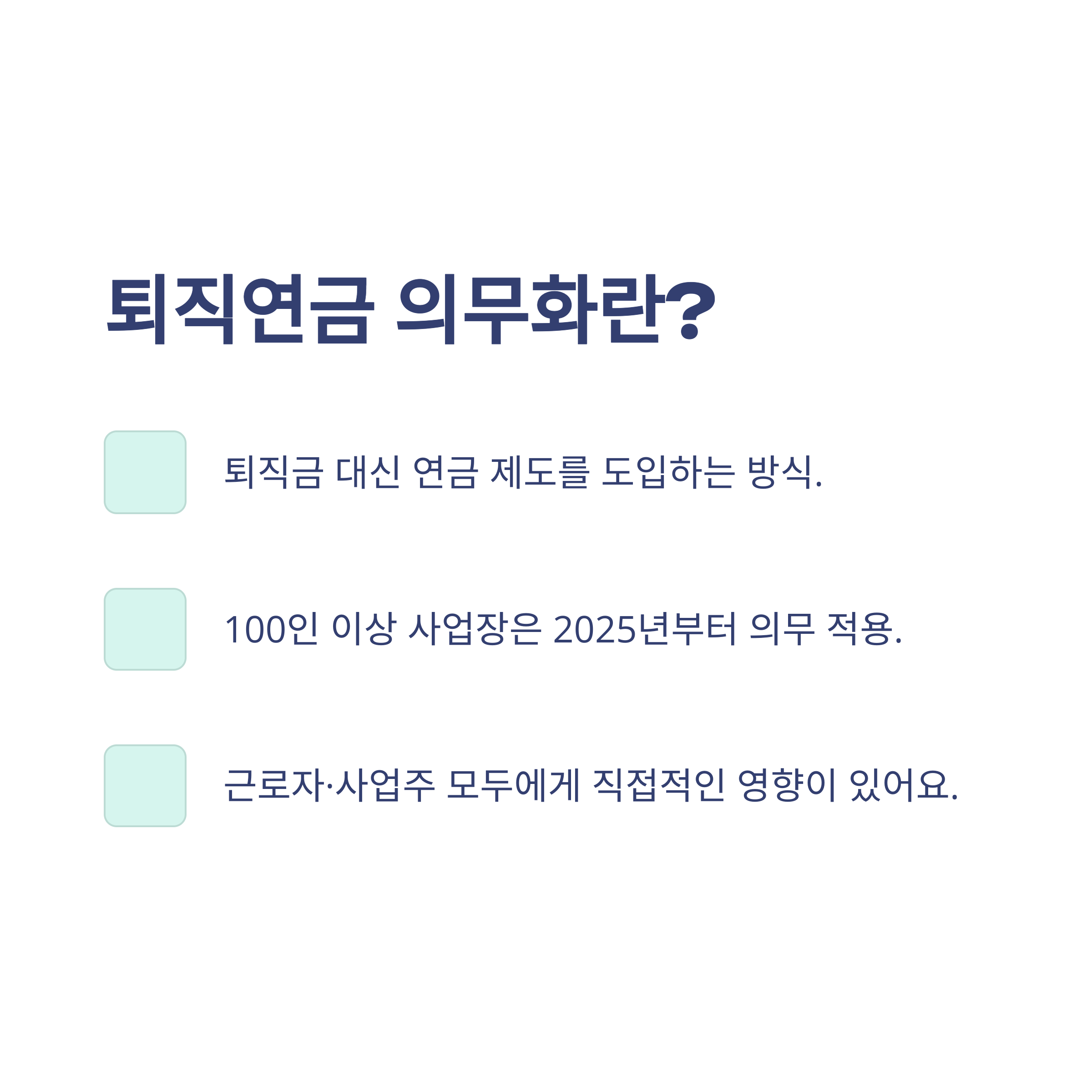 퇴직연금 의무화에 대한 궁금증을 한눈에 해결하세요. 계도기간부터 법안 현황, 퇴직금 지급기준까지 경험과 사례를 토대로 쉽게 정리한 안내입니다.
