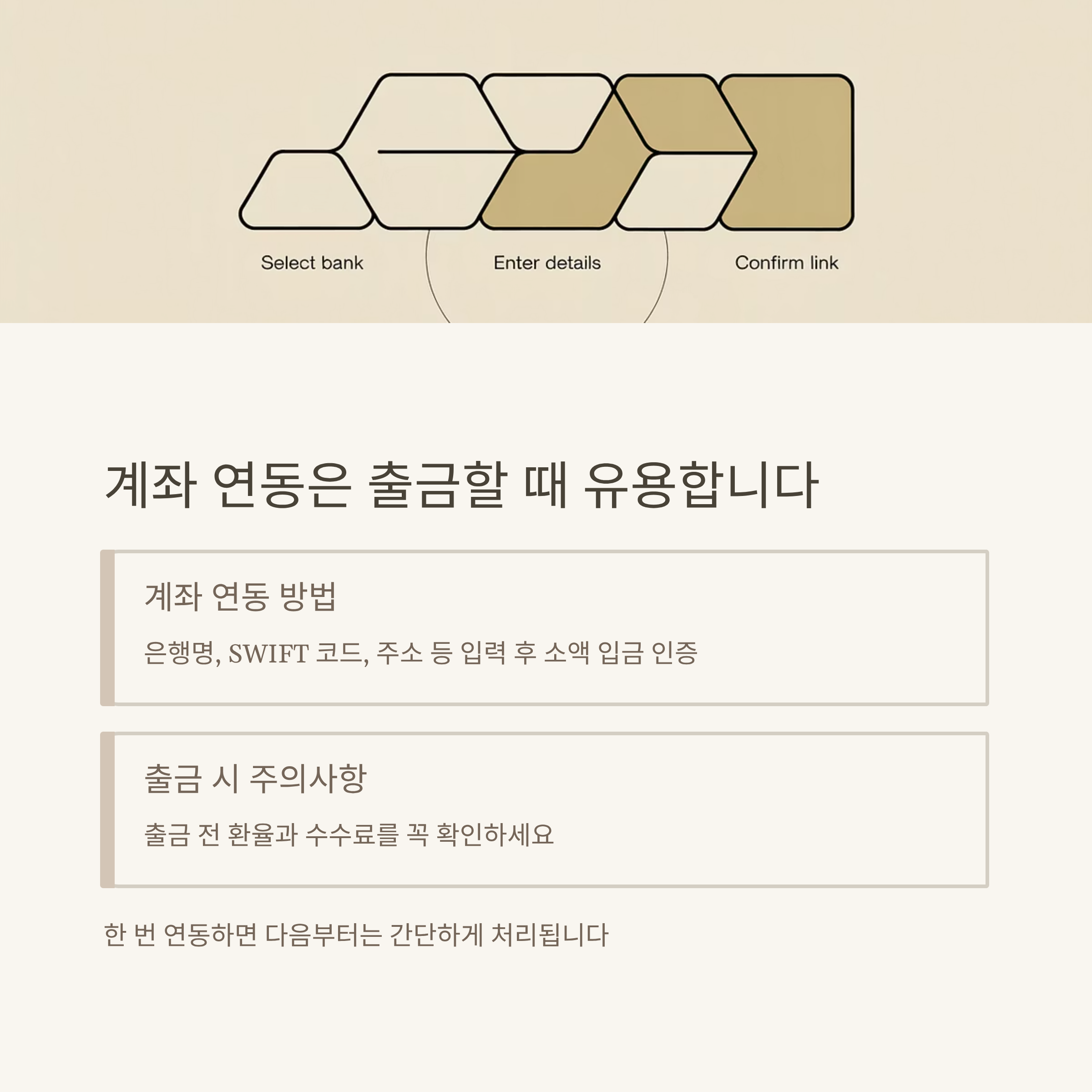 계좌 연동은 시간이 조금 걸릴 수 있지만, 한 번 인증되면 이후 출금은 편하게 처리할 수 있습니다. 특히 환전 수수료를 고려해서 어느 시점에 출금할지 결정하는 게 중요해요.