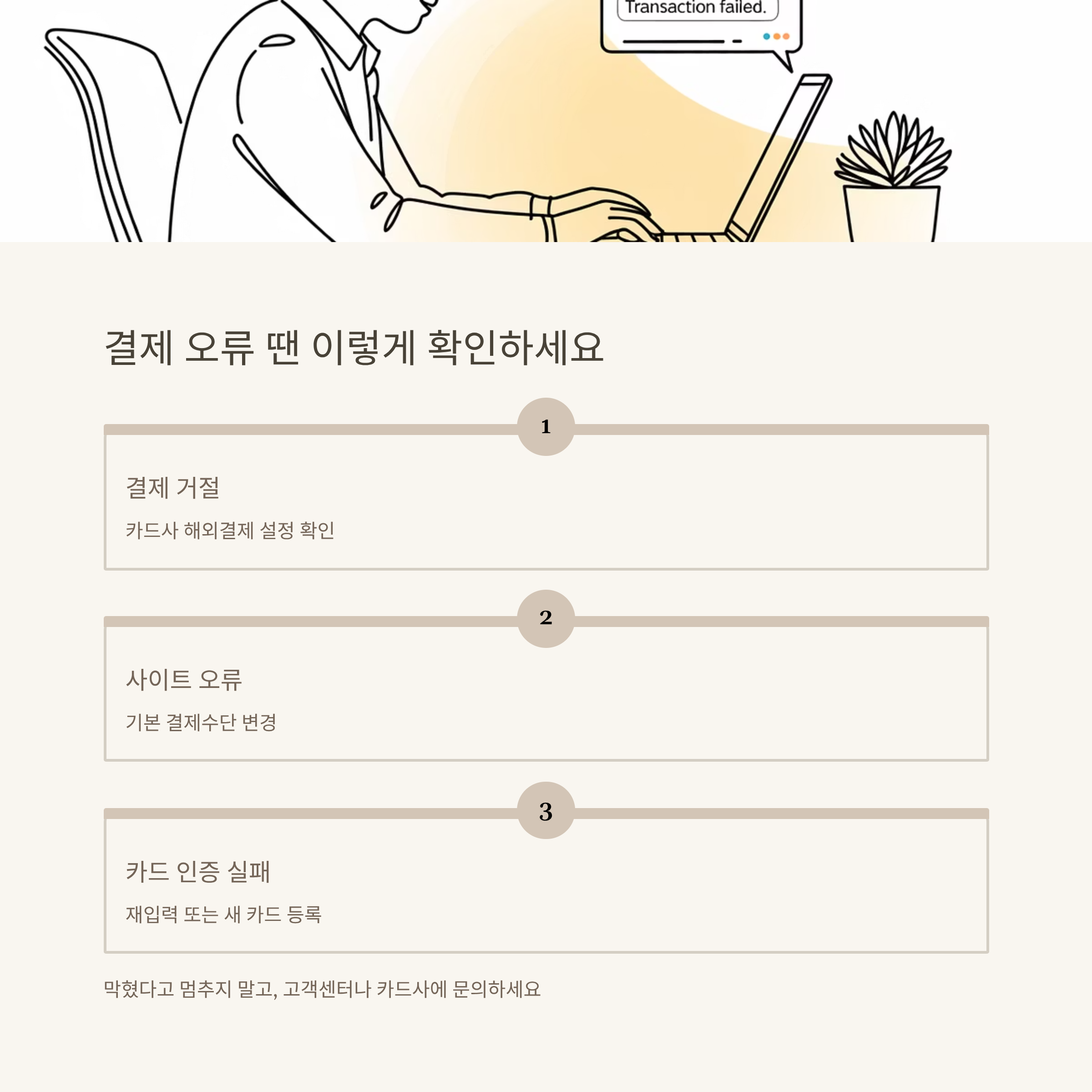 | ‘결제 거절’ 메시지 발생 | 카드사 해외결제 설정 확인, 한도 부족 여부 확인 |