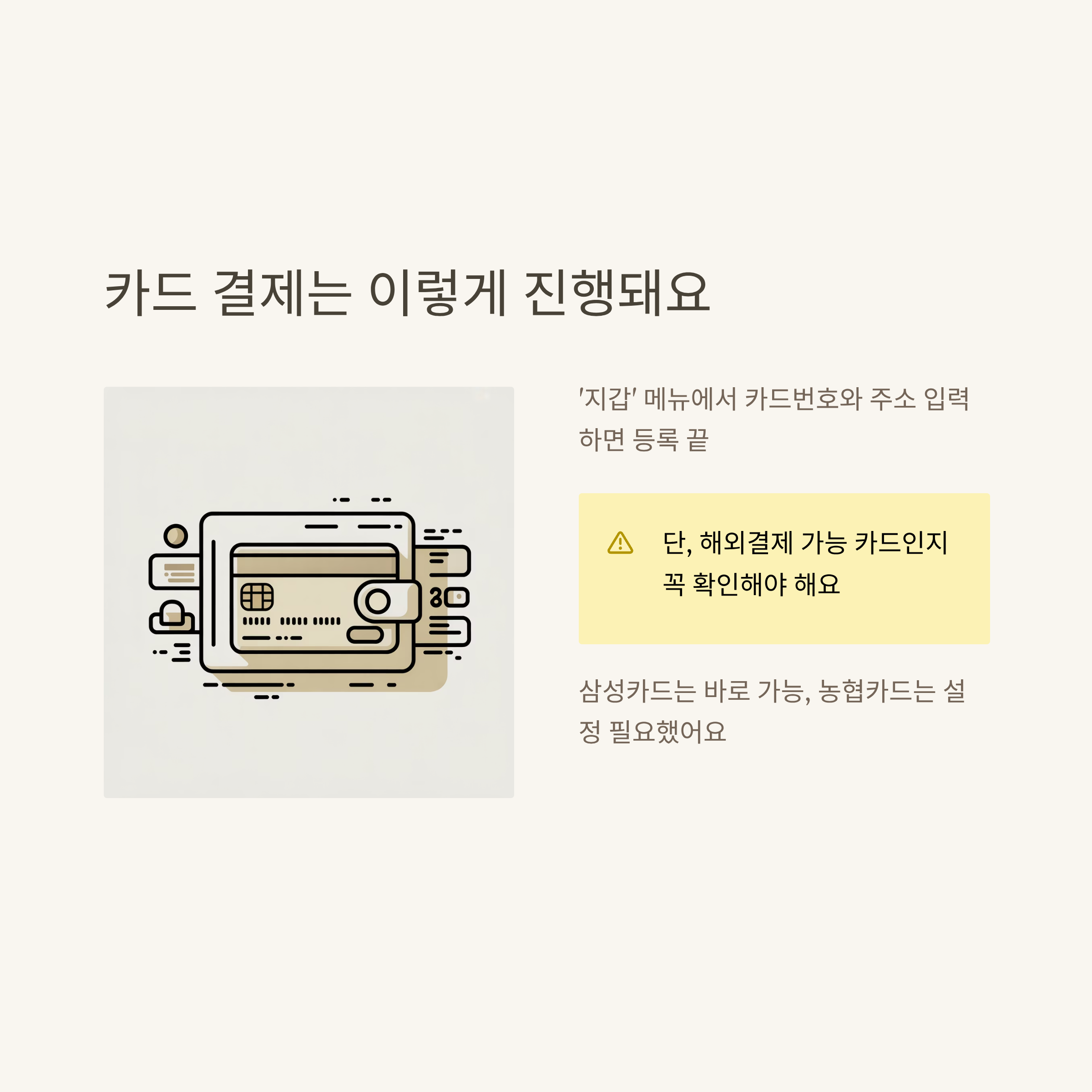 여기서 한 가지 팁을 드리자면, 카드의 해외결제 기능이 활성화되어 있어야 해요. 국내 발급 카드 중 일부는 기본적으로 해외결제가 막혀있는 경우가 있어서, 카드사 앱이나 고객센터에서 미리 확인해두시는 게 좋아요.
