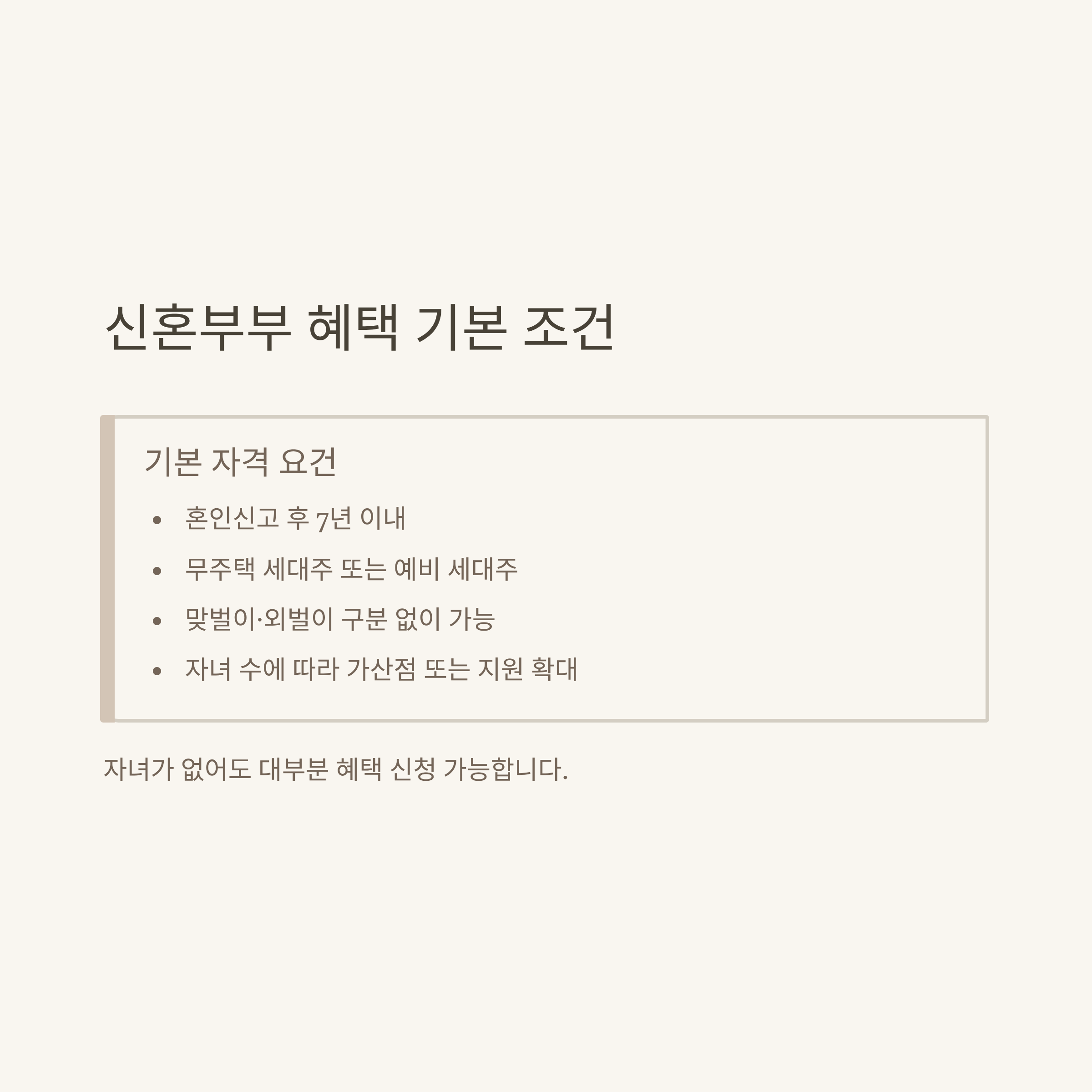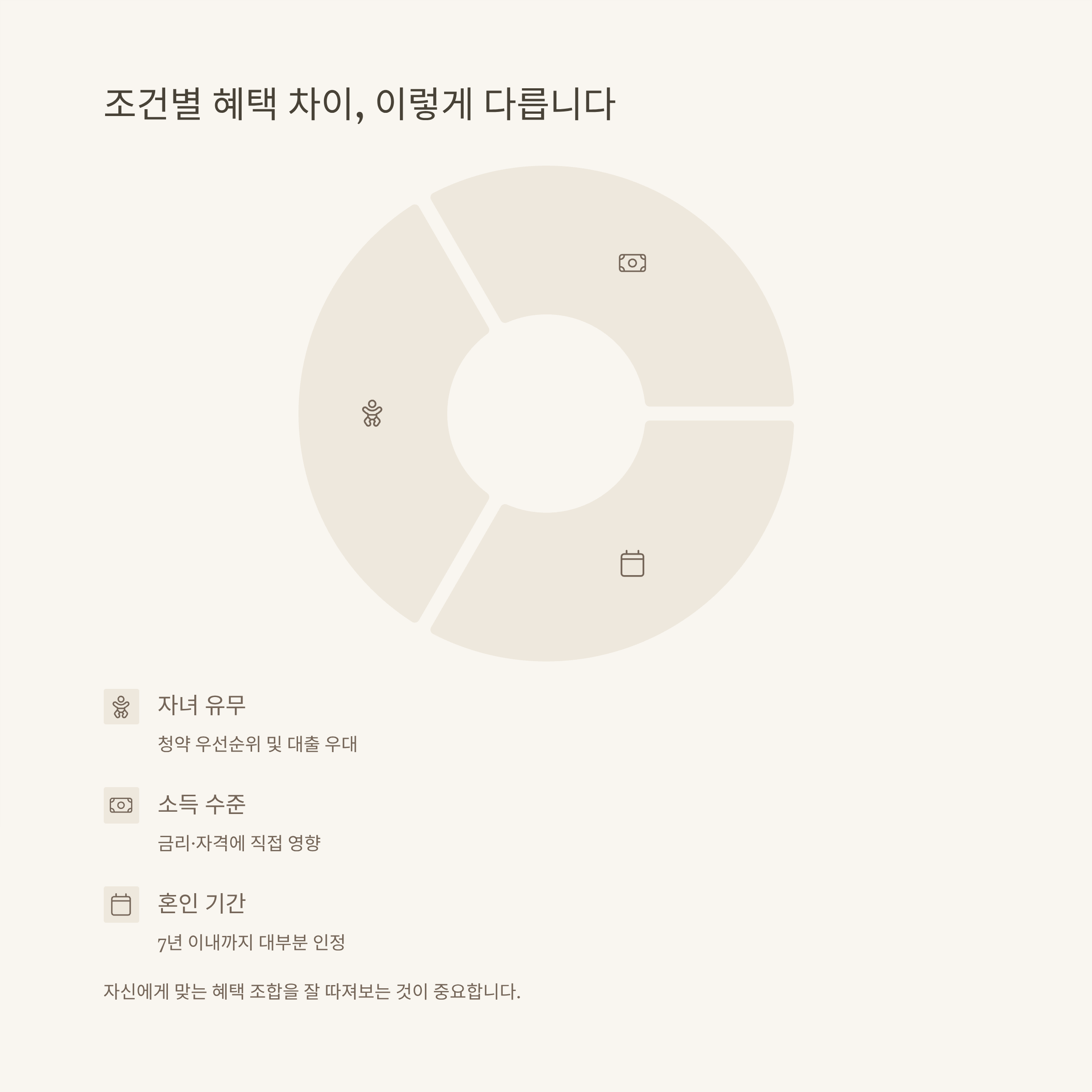 이 세 가지는 신혼부부가 어떤 혜택을 받을 수 있는지를 결정짓는 기준입니다. 특히 자녀가 있는 가구는 혜택이 크기 때문에 청약이나 대출을 고려할 때 큰 장점으로 작용합니다.