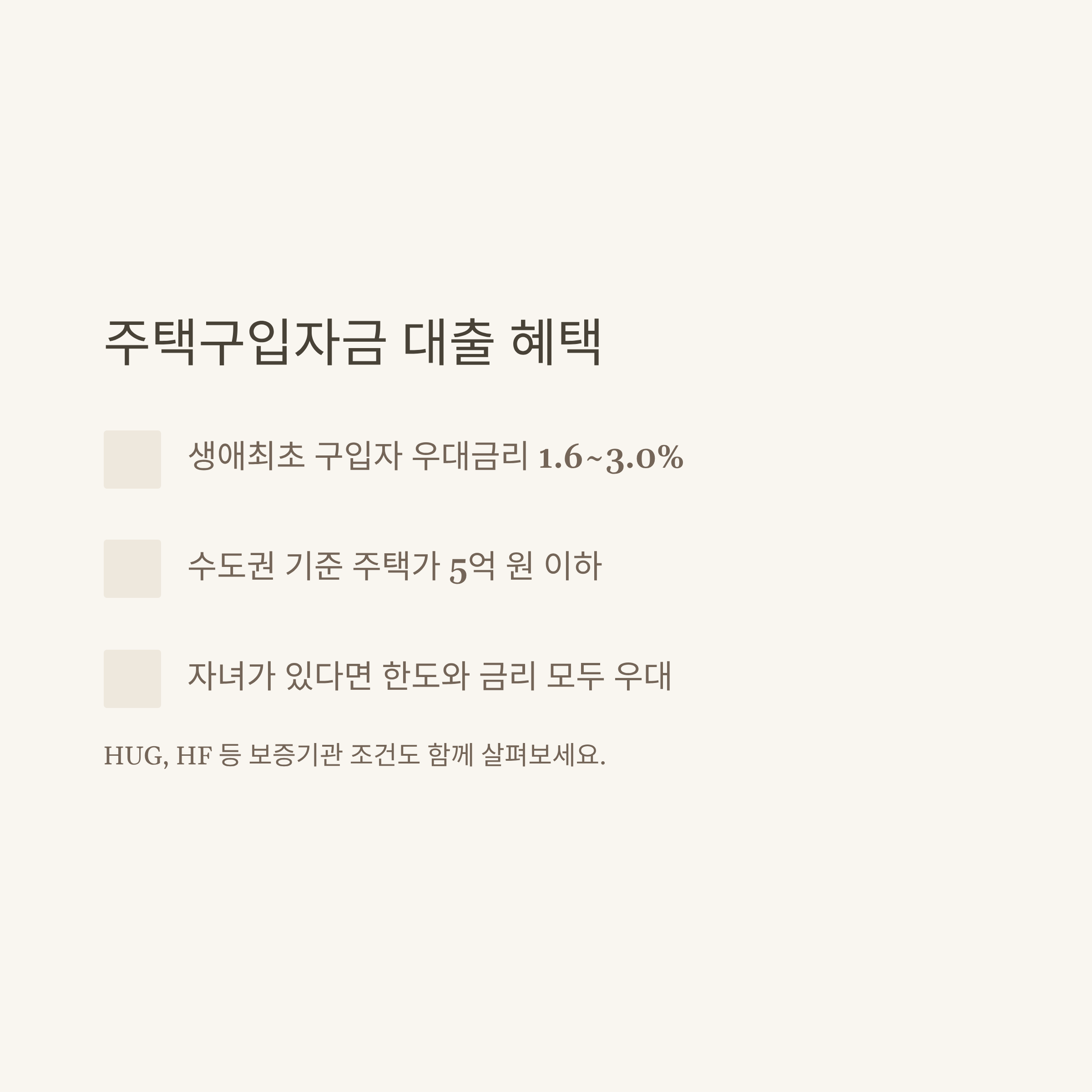 - 주택 구입가: 수도권 기준 5억 원 이하 (전용면적 85㎡ 이하)