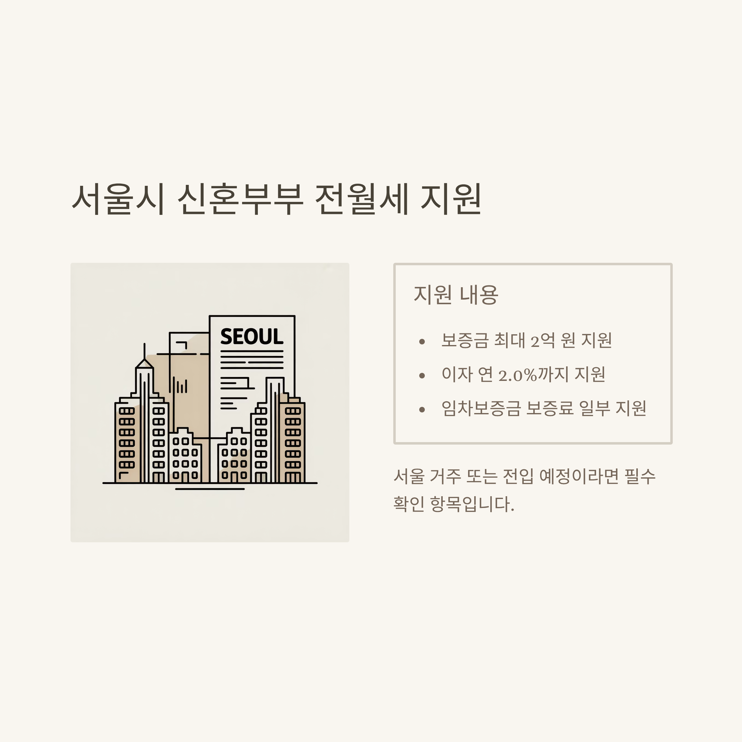 서울시는 전세보증금 지원뿐만 아니라 신혼부부 전월세보증금 이자지원 제도도 운영하고 있습니다. 서울시에 거주 중이거나 전입 예정인 분들은 반드시 챙기셔야 할 혜택입니다.