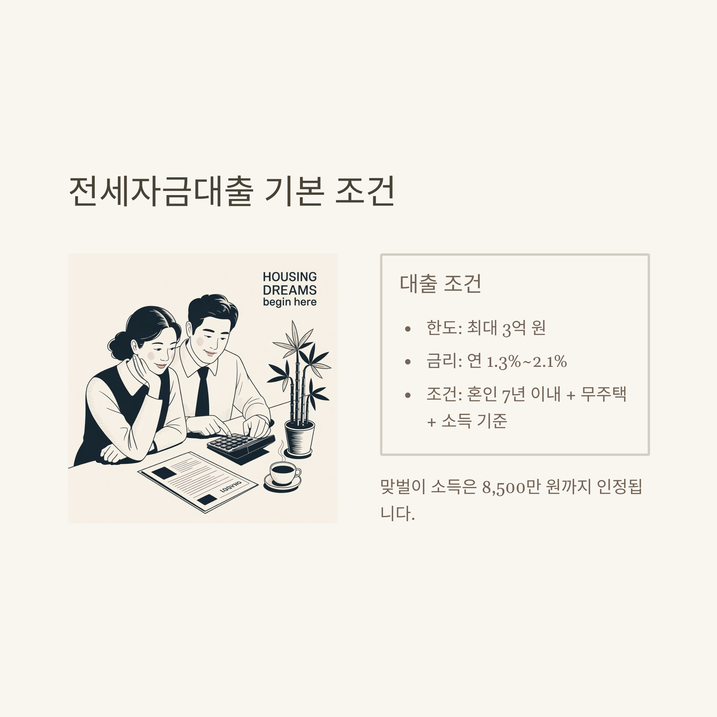 신혼부부의 주거비 부담을 줄이기 위해 정부에서는 버팀목 전세자금 대출과 신혼부부 전용 대출 프로그램을 운영 중입니다. 2025년 기준, 다음과 같은 조건으로 지원되고 있습니다.