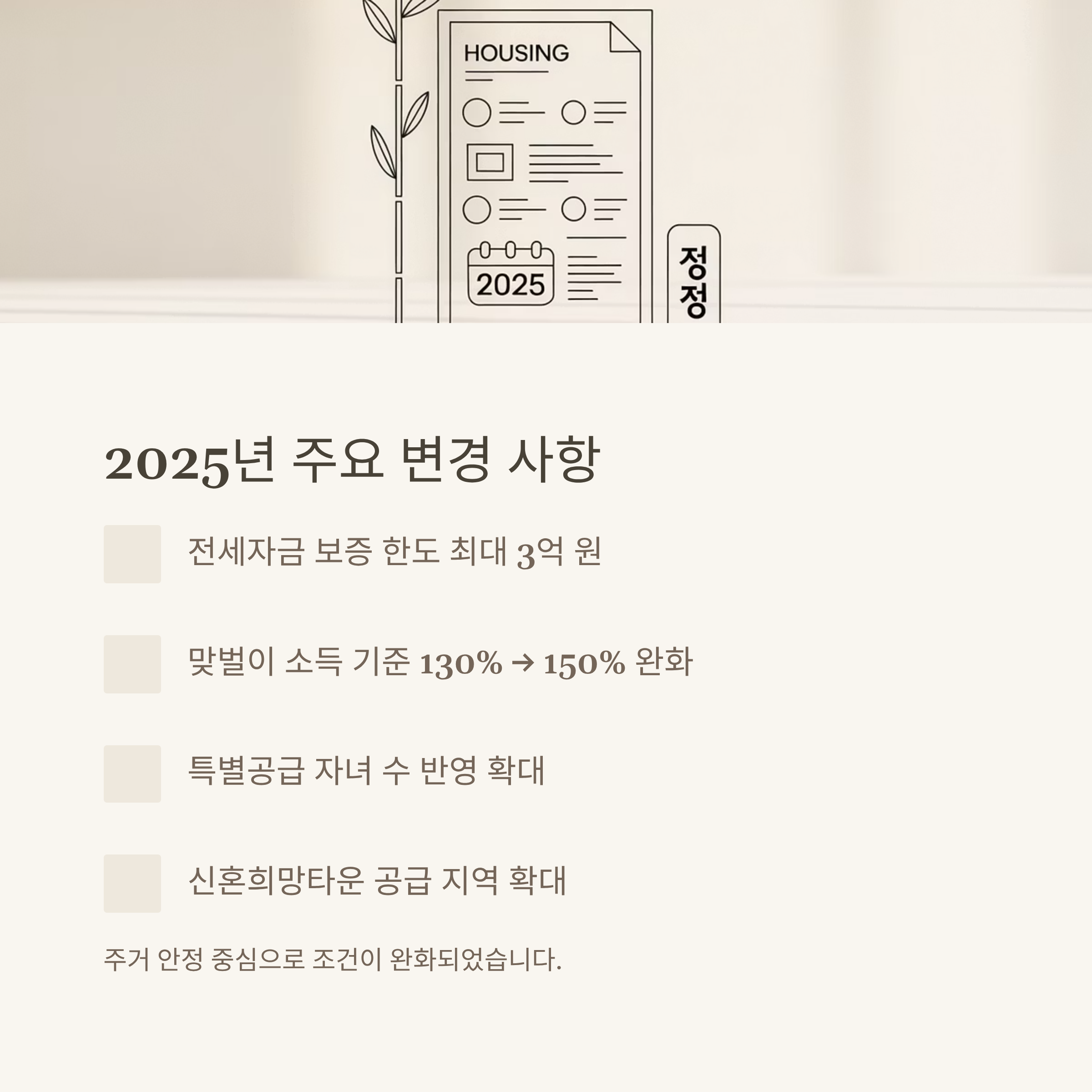 2025년에는 신혼부부 대상 지원제도에 일부 조정이 있었습니다. 가장 큰 변화는 소득 기준 완화와 특별공급 대상 확대, 주거비 지원 강화입니다. 실수요 중심으로 혜택이 더 넓어졌다고 보시면 됩니다.