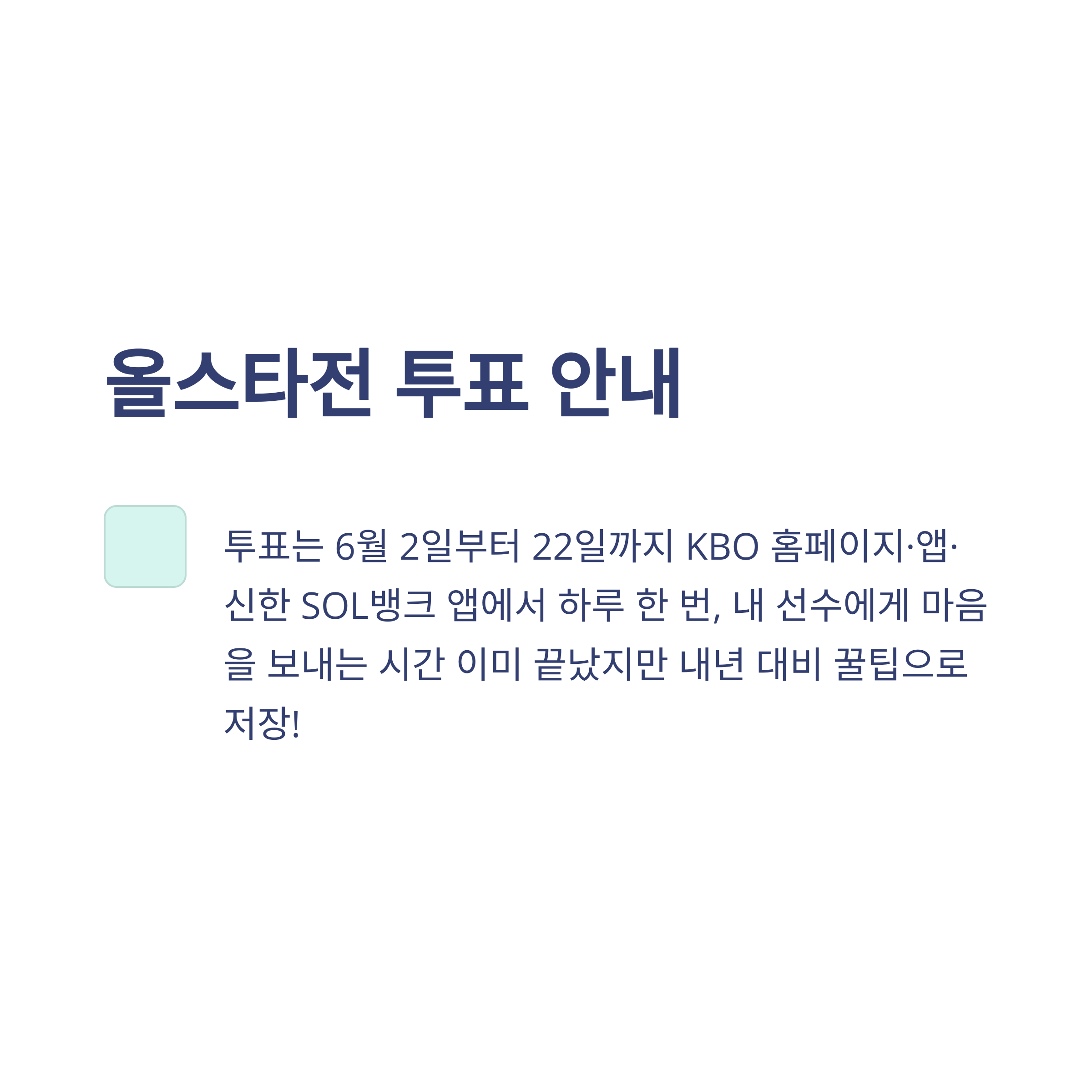 팬 투표는 KBO 공식 홈페이지, KBO 앱, 신한 SOL뱅크 앱에서 각각 1일 1회 가능하며, 투표 기간은 6월 2일 10시 ~ 6월 22일 14시였습니다. 제가 매일 잊지 않고 투표했는데, 응원하는 선수가 올라가서 뿌듯했어요.