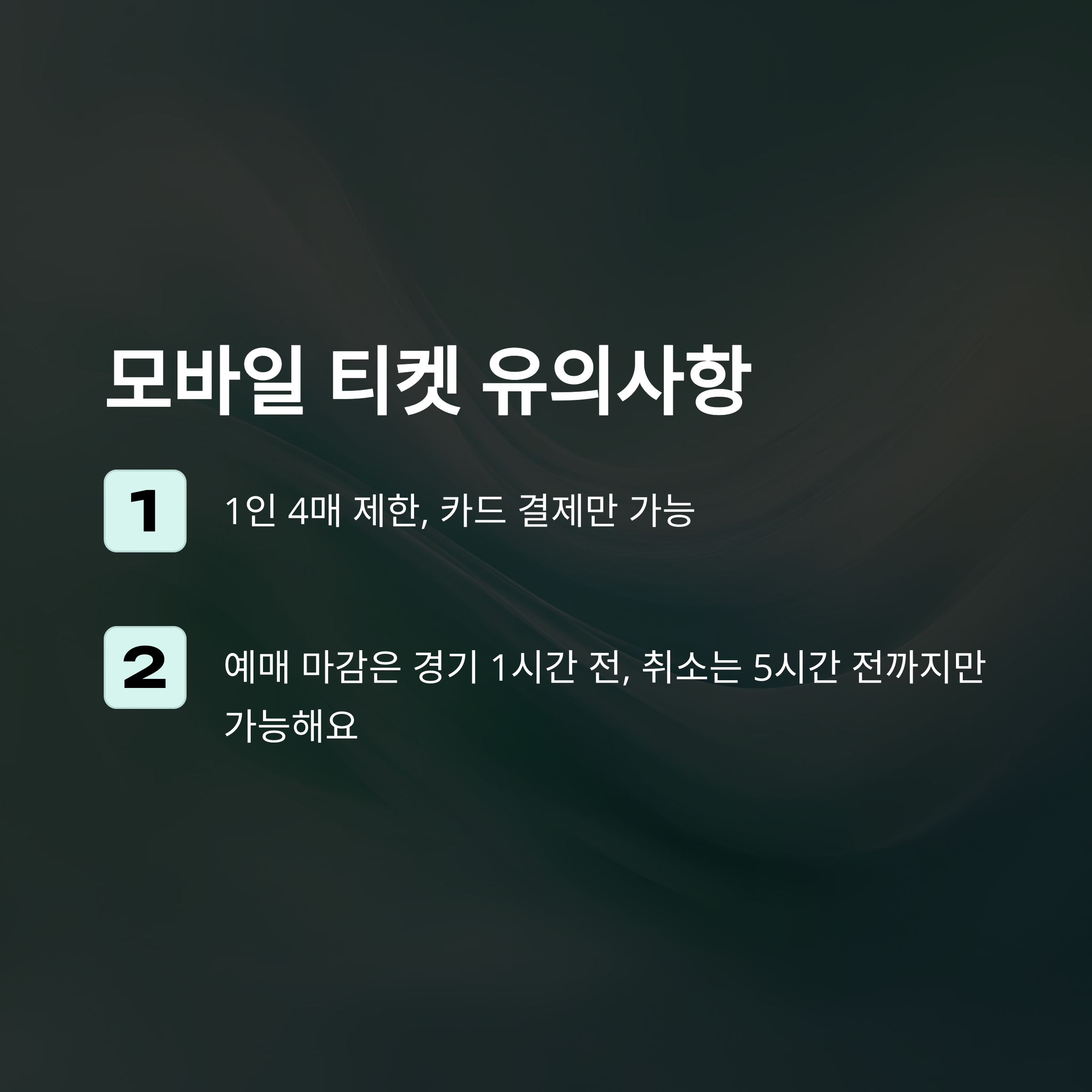 - 예매 마감은 경기 1시간 전, 취소 마감은 5시간 전