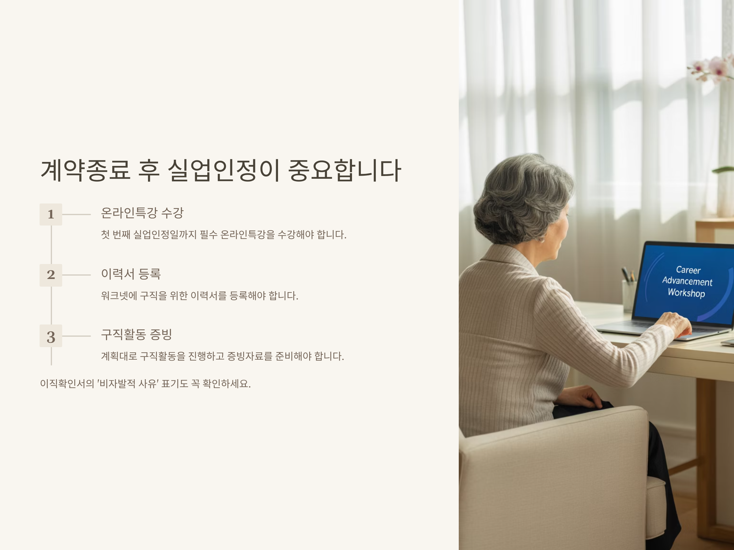 계약종료의 경우에는 회사에서 ‘이직확인서’를 발급해주어야 하고, 이 서류에는 근로계약 만료나 권고사직 등 비자발적 사유가 명확히 표기되어야 합니다. 이후 고용센터에서 서류 심사 후, 실업인정교육(온라인특강 또는 집합교육)을 이수하고, 정해진 1차 실업인정일까지 구직활동계획서 제출, 구직사이트(워크넷 등) 회원가입 및 이력서 등록 등이 반드시 필요했습니다.