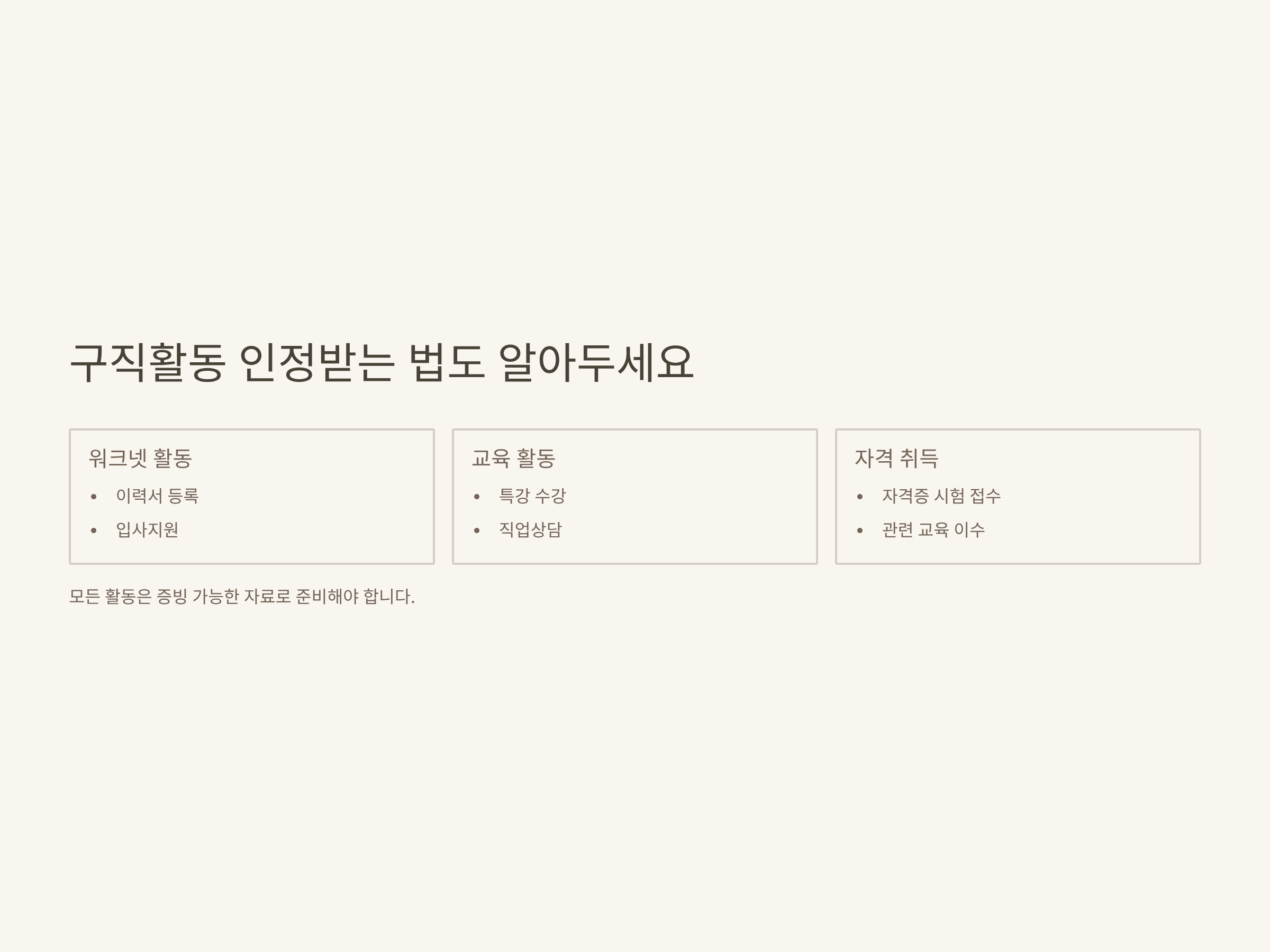 | 구직활동계획서 제출 | 워크넷 등 구직신청 | 실업인정일 전 필수 |