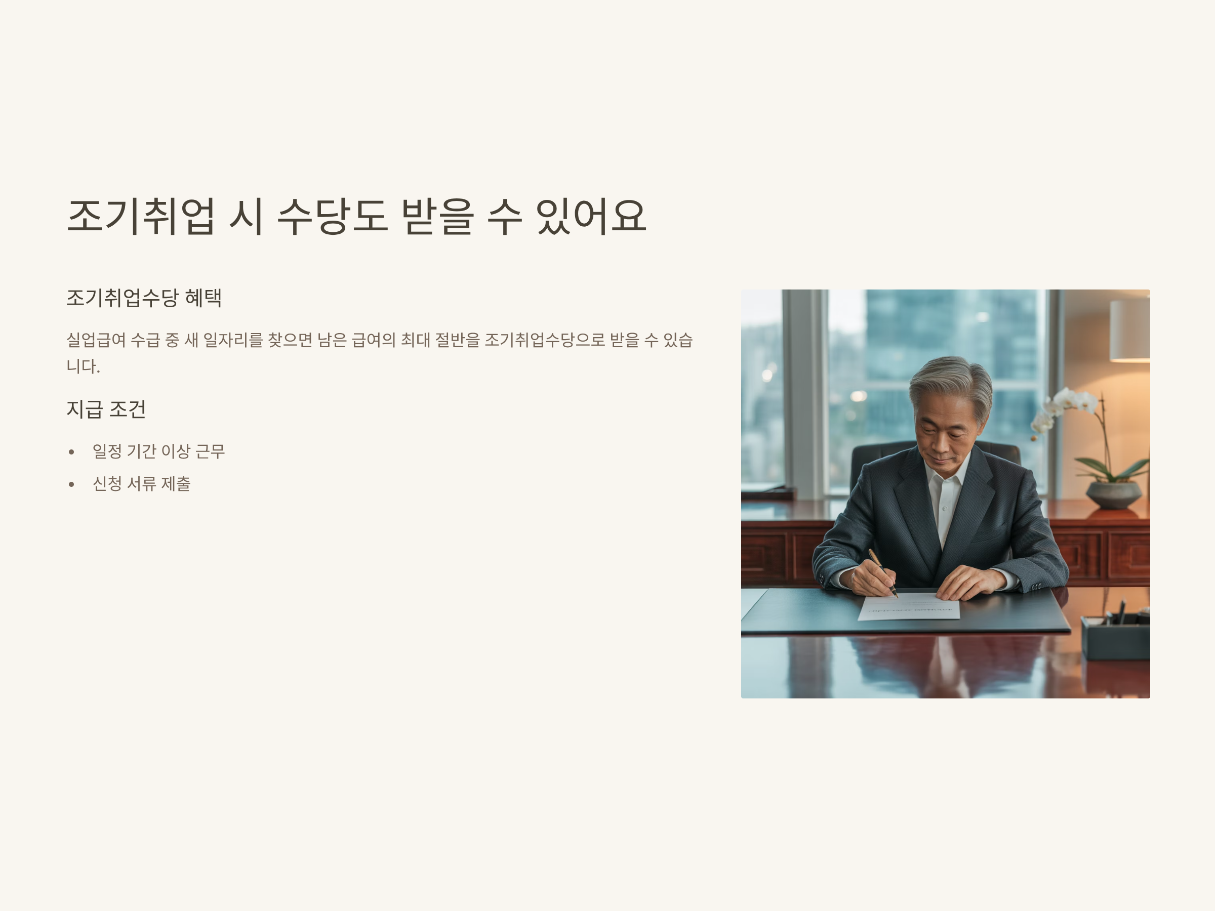 실제 주변에서 65세이상 실업급여를 받다가 새로운 일자리를 빨리 찾으시는 분들도 많았는데, 이럴 때는 ‘조기취업 수당’ 또는 ‘실업급여 감면제도’를 반드시 확인해야 합니다. 실업급여 수급 기간 중 취업하게 되면, 남은 지급일 수에 따라 일정 금액을 ‘조기취업수당’으로 일시 지급받을 수 있습니다.