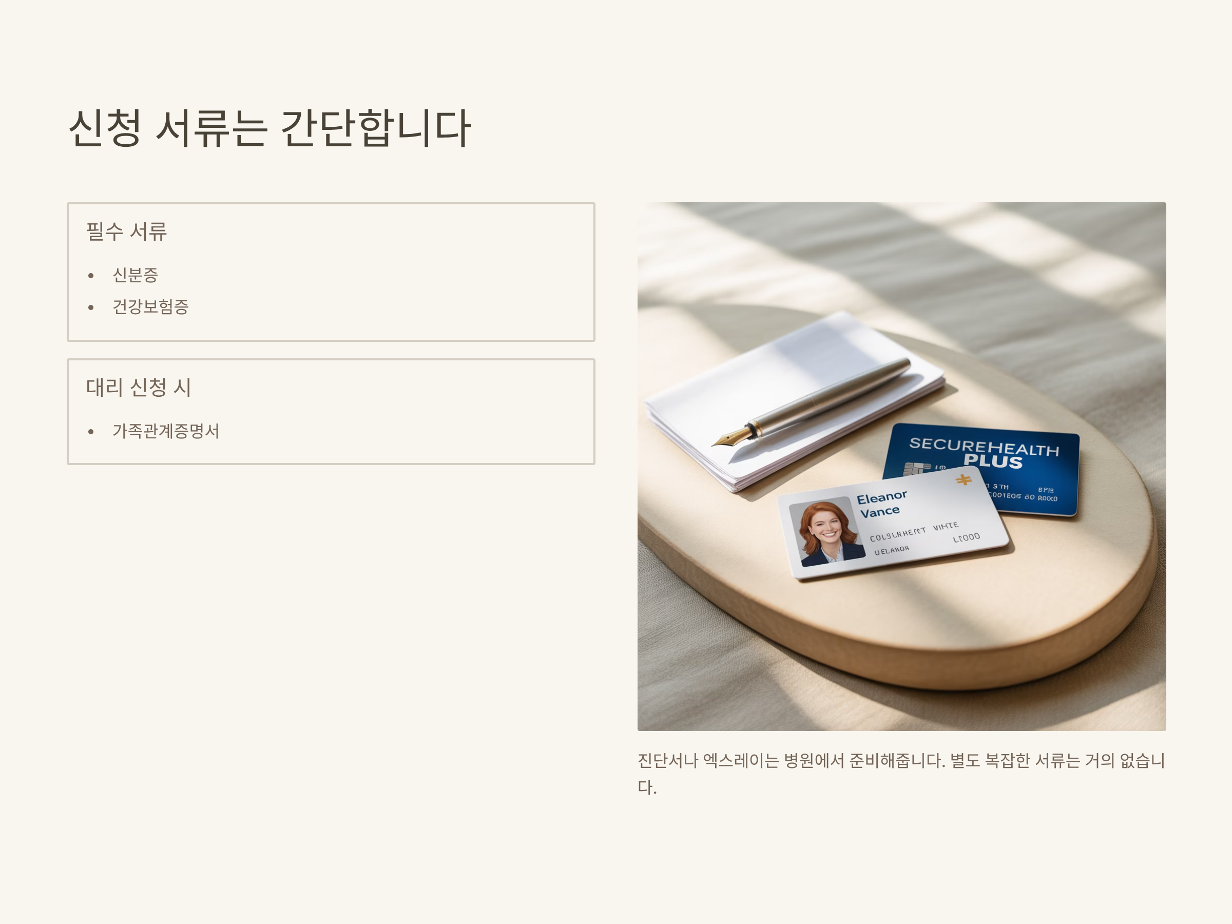 준비물을 잘 챙기면 현장에서 절차가 훨씬 빨라집니다. 혹시 서류가 불충분하면 병원에서 추가 안내를 해주니 걱정하지 않으셔도 됩니다.