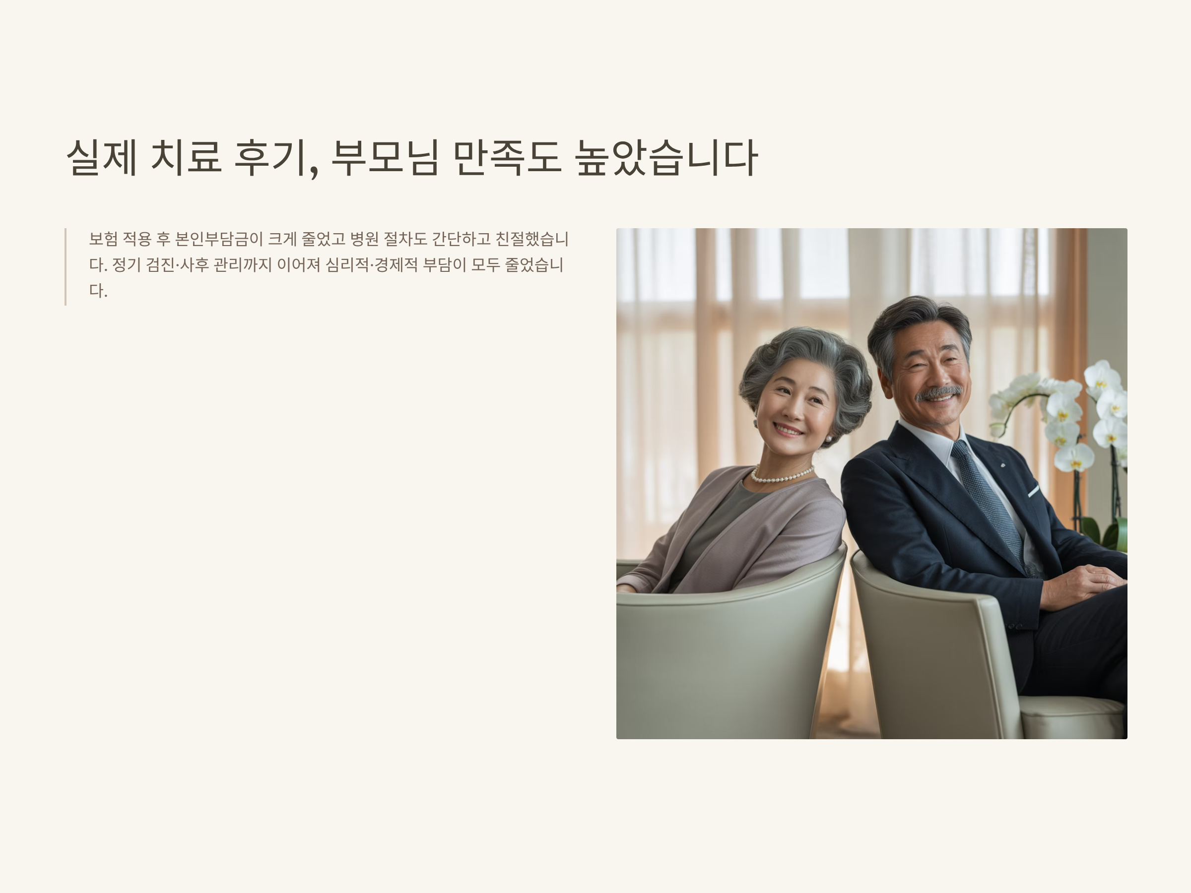 특히 견적서를 직접 받아보니 보험 적용 전과 후의 차이가 정말 컸고, 병원에서도 보험 적용 한도와 절차를 꼼꼼하게 안내해줘서 혼자 진행하실 때보다 심적으로도 안심이 됐습니다.