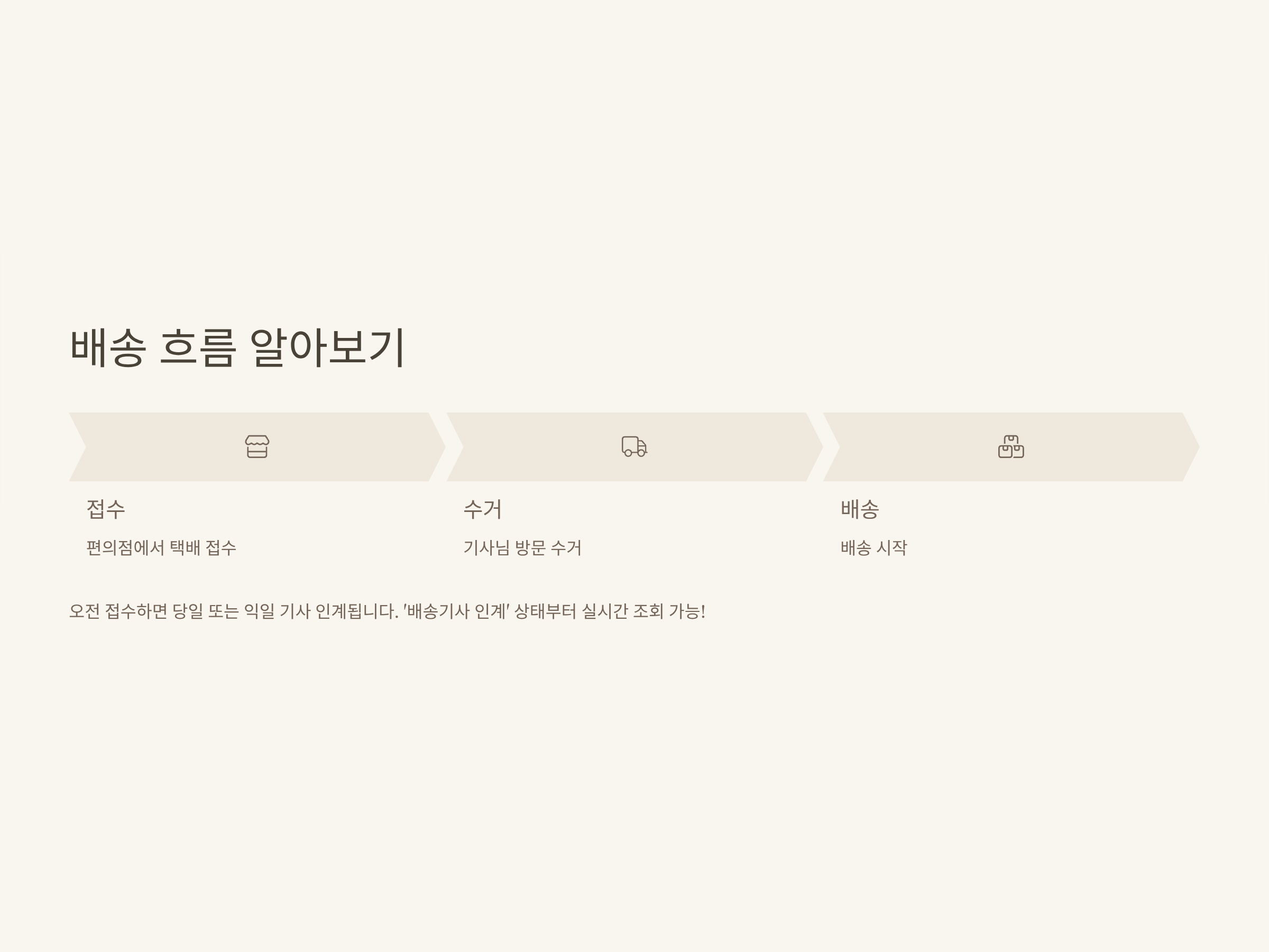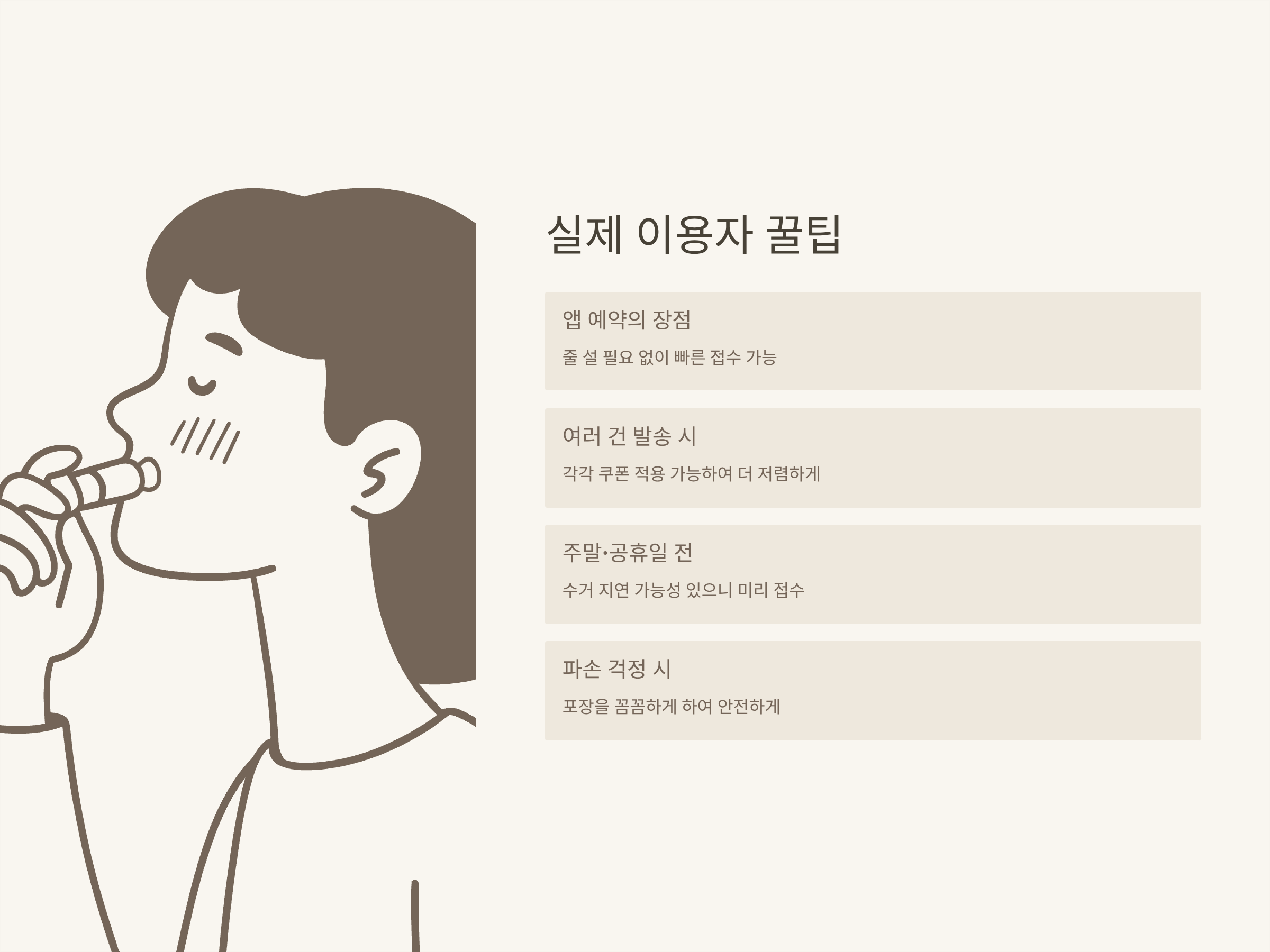 유의하실 점은 공휴일 전날이나 주말 접수 시 수거 주기가 느려질 수 있으니, 급한 물품일 때는 되도록 평일 오전에 접수하는 것이 가장 빠릅니다. 기사 인계 이후에는 일반 택배와 동일하게 배송이 진행되니 안심하고 기다리시면 됩니다.
