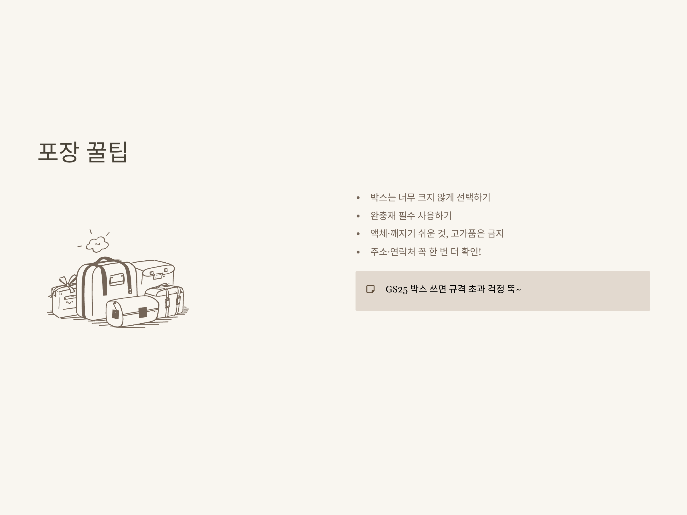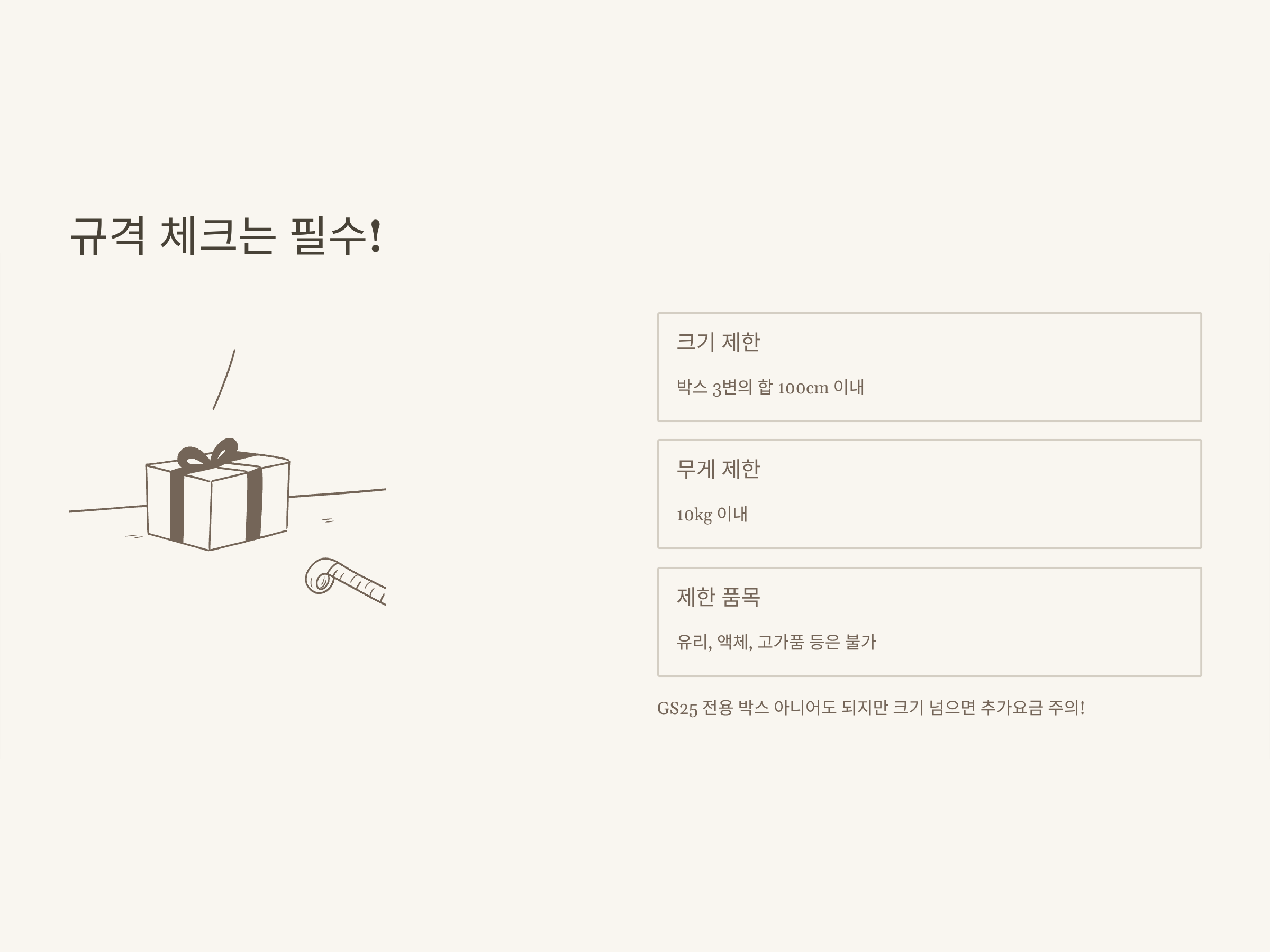 GS25 전용 박스를 이용하면 규격 초과 걱정이 적고, 완충재나 신문지 등으로 빈 곳을 잘 채워주면 파손도 예방할 수 있죠. 단, 액체류·파손 위험 물품·고가품 등은 안전상 배송이 제한되니, 반드시 금지 품목 안내를 체크해 주세요.