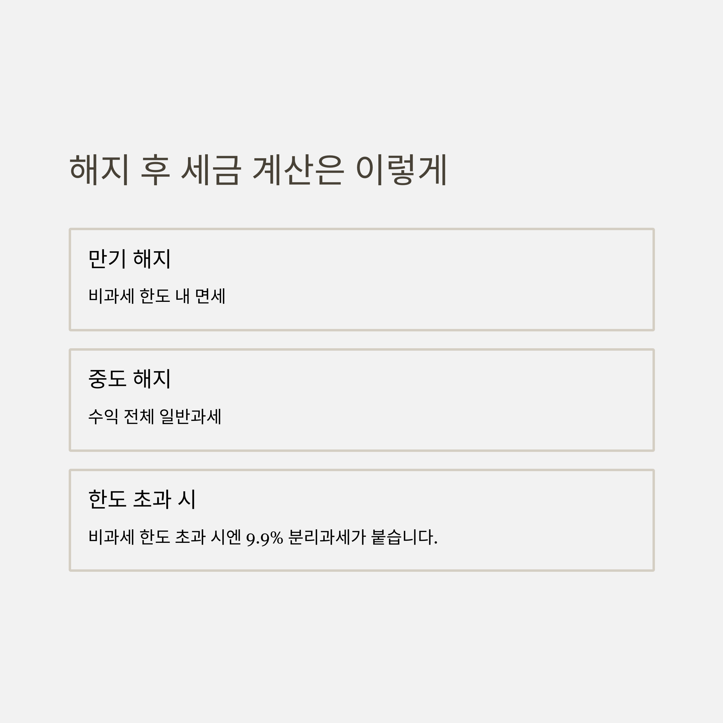 만기 해지 | 비과세 한도까지 면세, 초과분은 9.9% 분리과세 |