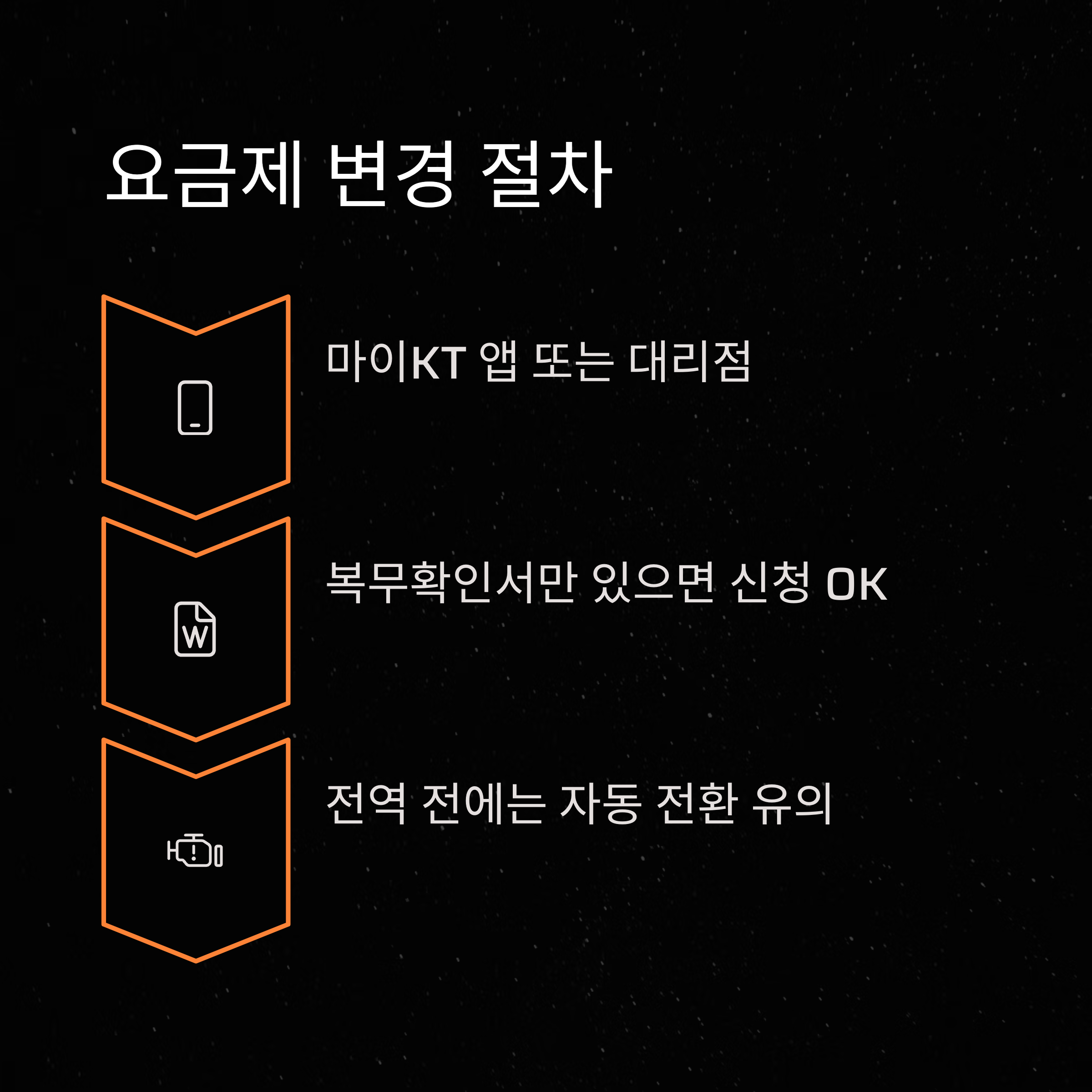 - 기존 약정 상태 확인: 남아있는 약정이 있다면, 요금제 변경 시 위약금이 발생할 수 있습니다. KT 고객센터(114)나 마이KT 앱에서 확인 가능해요.