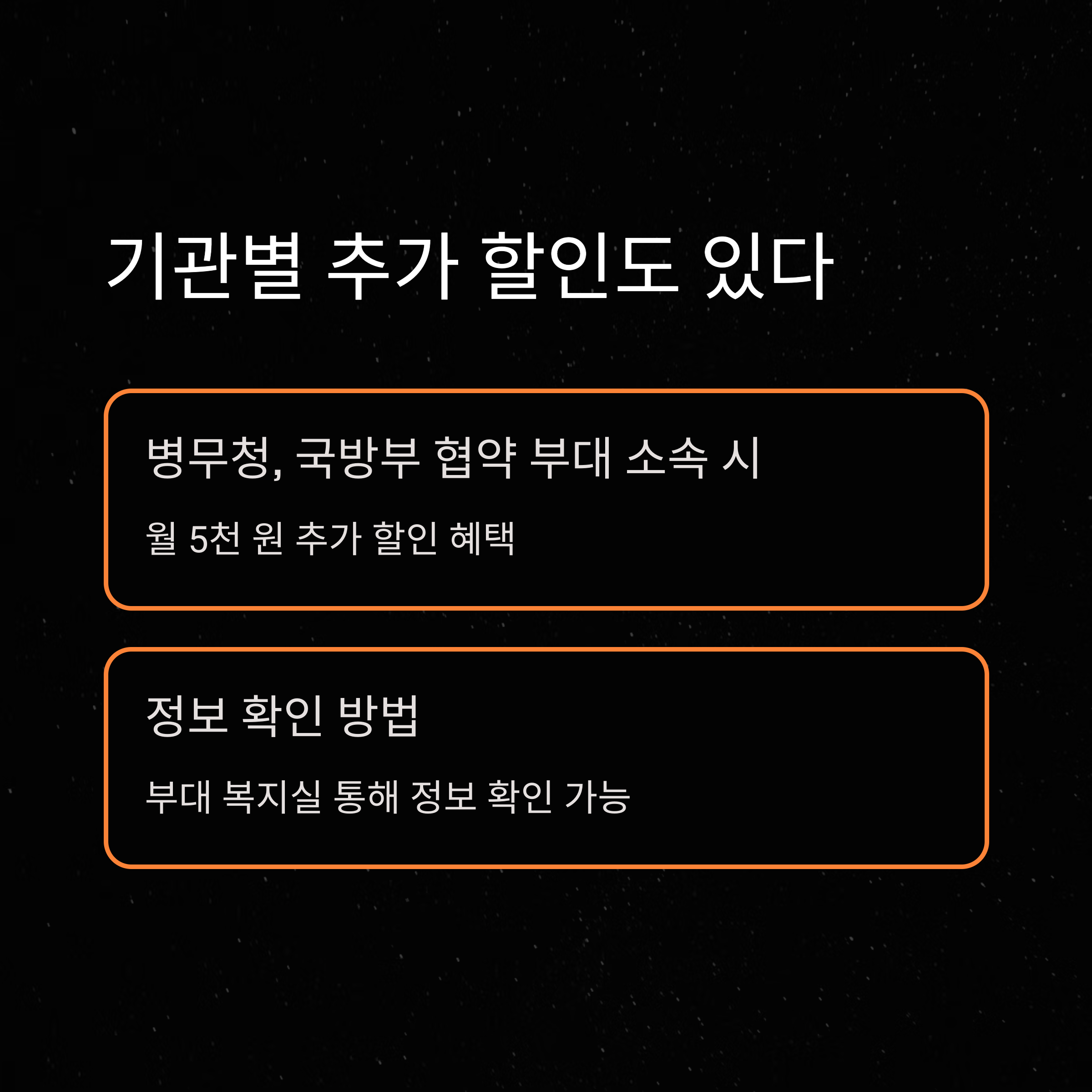 남편처럼 협약 대상 부대에 근무 중이시라면, 추가 혜택을 꼭 챙기셔야 해요. 같은 요금제라도 더 저렴하게 이용할 수 있으니까요.