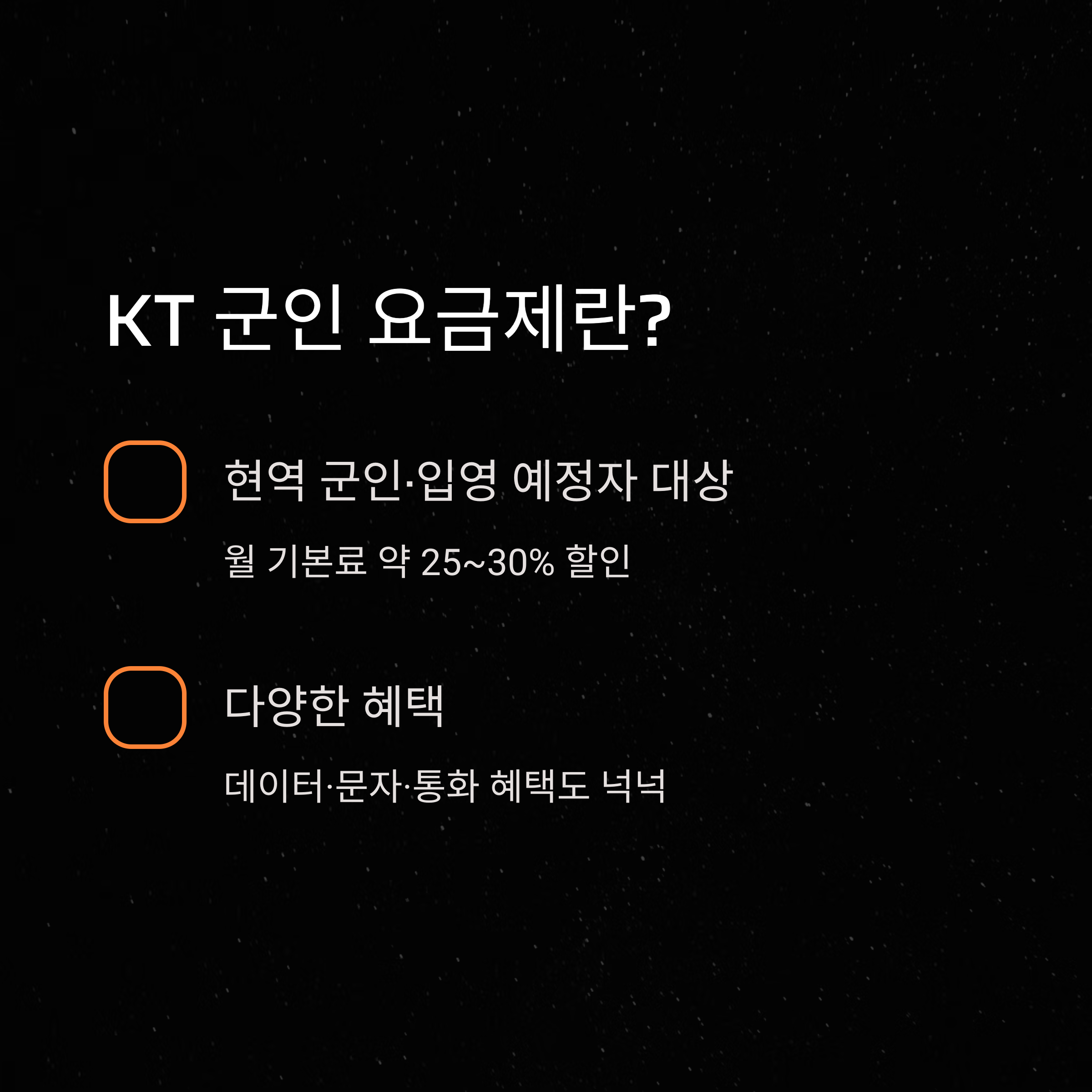| 오프라인 신청 | KT 대리점 방문 → 복무확인서 또는 군인증 제시 → 현장 상담 후 가입 완료 |